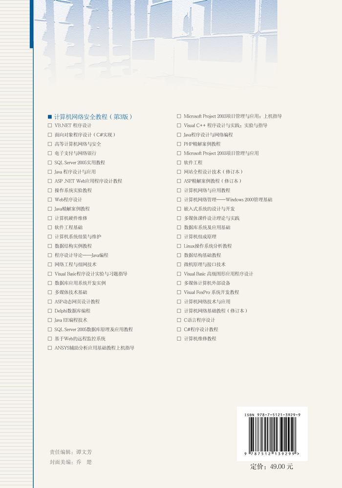 第3版在第2版的基础上,参考了很多读者的意见,做了大量修整和扩充,使之更加适合高校教学和自学的需要。本书利用大量的实例讲解知识点,将安全理论、安全工具与安全编程三方面内容有机地结合到一起,每章最后都配有大量的习题,用来检查教学和学习的效果。 与之前版本的比较 2004年初,《计算机网络安全教程》(第1版)出版,目的是解决网络安全技术教学的迫切需要。该版综合了作者在北京大学计算机研究所部分研究内容、清华大学计算机系部分教学内容,以及网络信息安全国际认证考试的部分内容,在第1版的写作过程中还得到了当时三院院士王选老师的支持和指导。本书出版以来,受到了广大读者,特别是高校师生的认可和欢迎,同时,很多读者也提出了很多中肯的批评和改进意见。当前,网络安全是计算机相关领域中的一门重要学科,很多高校和研究机构都设置了网络信息安全本科专业,以及网络信息安全方向的硕士点和博士点。 2007年初对本书第1版做了一次全面的更新,出版了《计算机网络安全教程》修订版,在保证第1版整体结构的情况下,对内容进行了全面的扩充和修正,一个主要的特点是理论性的增强,主要做了如下6方面的调整。 (1)增强了书的理论性并全面阐述了网络安全两个重要的概念:恶意代码和Web安全。添加了两章,将全书扩充为12章。分别为:第7章恶意代码和第11章IP安全与Web安全。 (2)修正了部分内容不规范,图表不清楚的问题。 (3)全面扩充了拒绝服务攻击及分布式拒绝服务攻击的分类和原理。 (4)增加了安全操作系统的机制与原理。 (5)增加了数字签名、数字水印和公钥基础设施PKI的相关内容。...