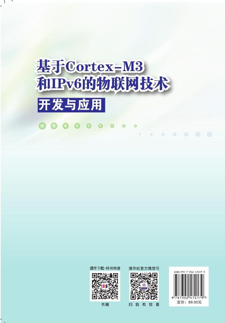 本书介绍了基于CortexM3和IPv6的物联网开发技术与应用,由浅入深地对物联网系统的开发进行介绍。全书采用任务式开发的学习方法,共积累了70个趣味盎然、贴近生活的案例,每个案例均有完整的开发过程,分别是明确的学习目标、清晰的环境开发要求、深入浅出的原理学习、详细的开发内容和完整的开发步骤,最后进行总结和拓展,引导读者轻松完成理论学习,并将理论与开发实践有机地结合起来。 本书按照知识点分类,将嵌入式系统和物联网系统的开发技术、CortexM3接口技术、传感器驱动、无线传感网络技术、Contiki操作系统基本知识和网络技术、IPv6综合开发技术、物联网平台开发技术、Android移动互联网开发结合在一起,实现了各种领域的物联网的数据采集、传输和控制,并提供案例及其源代码,读者可以快速上手。 本书既可作为高等院校相关专业的教材或教学参考书,也可供相关领域的工程技术人员查阅,且适合微处理器和物联网系统开发爱好者使用。