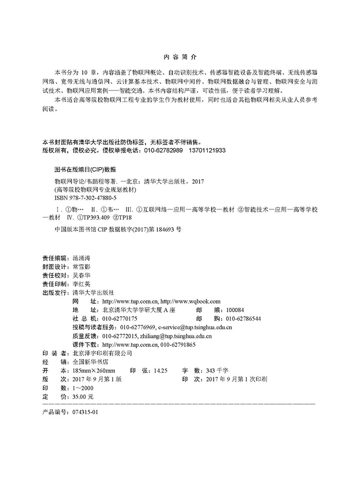 本书分为10章,内容涵盖了物联网概论、自动识别技术、传感器智能设备及智能终端、无线传感器网络、宽带无线与通信网、云计算基本技术、物联网中间件、物联网数据融合与管理、物联网安全与测试技术、物联网应用案例——智能交通。本书内容结构严谨,可读性强,便于读者学习理解。 本书适合高等院校物联网工程专业的学生作为教材使用,同时也适合其他物联网相关从业人员参考阅读。