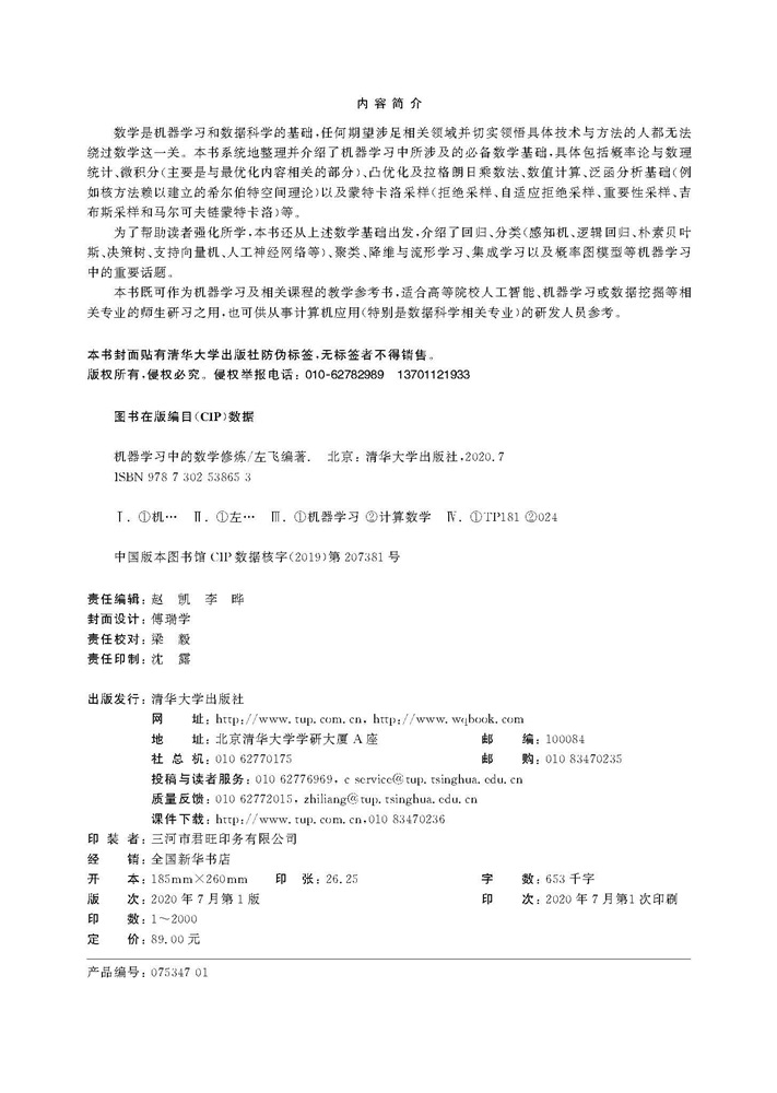 全书共分为两篇:在上篇中,将从浩瀚的数学海洋中撷取机器学习研究人员最为必须和重要的数学基础。内容主要包括:微积分(含场论)、数值计算和常用最优化方法、概率论基础与数理统计、线性代数等。在下篇中,将选取机器学习中最为常用的算法和模型进行讲解,这部分内容将涉及(广义)线性回归、图模型(包含贝叶斯网络和HMM等)、分类算法(包括SVM,逻辑回归,神经网络等)和聚类算法(包括K均值和EM算法等)等话题。