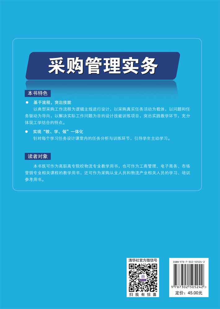 《采购管理实务》结合最新的职业教育理念及社会对采购人才的需求情况,本着“理论够用、注重实训”的原则,贯彻“任务驱动、项目引领”的教学理念,以培养职业能力为核心,以工作实践为主线,以工作过程为导向,用任务进行驱动,建立以行动体系为框架的现代课程结构。 《采购管理实务》共9个学习项目,18个训练任务。其中,项目一为采购与供应认知,引导学生对采购进行初步认识;项目二至项目九按照采购作业流程设置,依次为采购需求分析与计划制定、供应商开发与选择、采购方式确定、采购价格与成本控制、采购谈判与合同订立、采购过程管理、供应商管理、采购风险管理与绩效评估。 《采购管理实务》内容新颖、突出技能训练,并提供丰富的教学资源,适合作为高职高专物流专业教学用书,也可作为工商管理、电子商务、市场营销专业相关课程的教学用书,还可作为采购从业人员和物流产业相关人员的学习、培训参考用书。