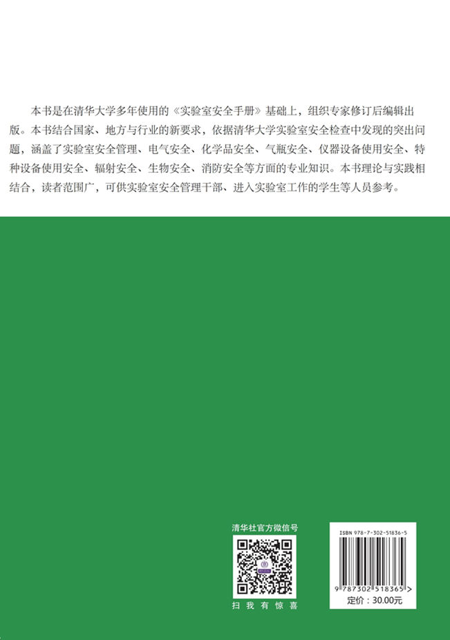实验室是高等院校及研究院所等单位教学实践和科学研究的主要基地。近年来,随着高校科研水平的提高及学科建设的迅速发展,实验室建设投入不断增加,实验室安全面临着巨大的压力,事故时有发生,对人才培养工作造成了一定的负面影响。因此,发布普适性的安全手册,传播实验室安全文化,在师生员工进入实验室工作之前获取必备的安全知识,显得意义重大。《清华大学实验室安全手册》是清华大学实验室与设备处老师组织管理干部和安全专家进行分工,依据国家与地方的最新制度与技术规范,结合在实验室教学与管理中发现的实际问题,按专业类进行编排修订而成。对保护广大实验室管理者与实验操作人员的职业健康与安全意义重大。