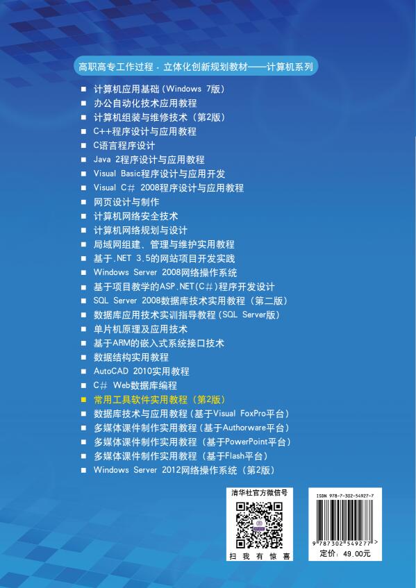 《常用工具软件实用教程(第2版)》由浅入深、系统全面地介绍了**实用工具软件。全书共分12章,内容包括安全工具软件、系统优化和维护工具软件、磁盘工具软件、文件处理工具软件、光盘工具软件、电子图书浏览和制作工具软件、语音转录及翻译工具软件、图像处理工具软件、娱乐视听工具软件、数字音频处理工具软件、数字视频处理工具软件以及网络常用工具软件等。 《常用工具软件实用教程(第2版)》以工作场景导入—知识讲解—回到工作场景—工作实训营为主线组织编写,每一章都精心挑选了具有代表性的实训题,并对工作中的常见问题进行解析,以便于读者掌握本章的重点和提高实际操作能力。《常用工具软件实用教程(第2版)》结构清晰、易教易学、实例丰富、可操作性强、学以致用,对易混淆和实用性强的内容进行了重点提示和讲解。 《常用工具软件实用教程(第2版)》既可作为高职高专院校的教材,也可作为各类培训班的培训教程。此外,《常用工具软件实用教程(第2版)》也非常适合从事计算机常用软件技术研究与应用的人员参考阅读。