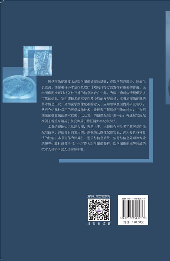 本书主要介绍了与医学图像配准相关的基础知识及常用的配准算法。内容包括四大部分: 第一部分(第1~5章)涉及医学图像配准的基础知识,阐述图像配准的原理、基本框架、分类,医学成像技术,图像配准算法的组成,插值方法及常用的图像配准开源平台; 第二部分(第6、7章)介绍了基于相关性的医学图像配准方法和目前常用的Demons非刚体图像配准算法; 第三部分(第8~10章)介绍了信息论测度在医学图像配准中的应用; 第四部分(第11、12章)介绍了基于特征的医学图像配准方法。 本书可作为高等院校计算机、通信与信息系统、信号与信息处理等专业的研究生教材或参考书,也可作为医学图像分析、医学图像配准等领域的技术人员和研究人员的参考书。