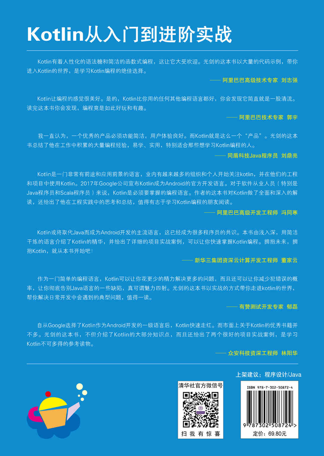 Kotlin是一门非常有前途和应用前景的语言,业内有越来越多的组织和个人开始关注kotlin,并在他们的工程和项目中使用Kotlin。2017年Google公司宣布Kotlin成为Android的官方开发语言。对于软件从业人员(特别是Java程序员和Scala程序员)来说,Kotlin是必须要掌握的编程语言。作者的这本书对Kotlin做了全面和深入的解读,还给出了他在工程实践中的思考和总结,值得有志于学习Kotlin编程的朋友阅读。
