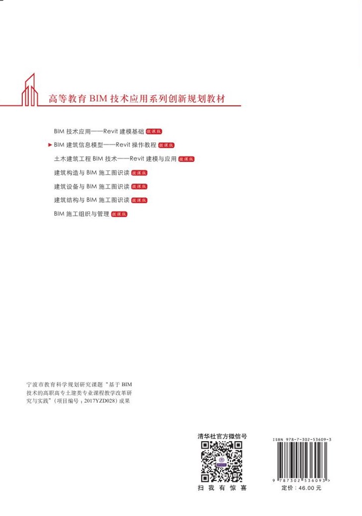 为方便教师教学和学生学习,本书配套与教材建立相对应的教学微视频、网络慕课课程、REVIT建模阶段性成果文件、CAD图纸、作业、BIM考级试卷等数字资源。学生可直接扫描书中的二维码就可观看视频,边看边操作,同时本书还提供了每一章节操作后的REVIT建模成果文件,供初学者对比学习,提高学习效率。