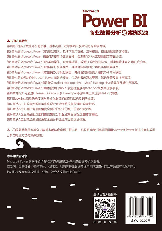 本书由资深数据分析师结合多年实际工作经验精心编撰,结合丰富案例循序渐进地介绍Power BI在商业数据分析中的应用技巧。全书共15章,主要内容包括:商业数据分析的思维与流程,Power BI的三种视图、视图编辑器的窗格,连接数据源的方法,Power BI查询编辑器、数据分析表达式DAX、创建和管理表之间的关系,Power BI自带可视化视图,Power BI自定义可视化视图,如何制作Power BI数据报表,Power BI连接Cloudera Hadoop Hive、MapR Hadoop Hive集群,如何使用Spark SQL连接Apache Spark,如何通过DBeaver、Oracle SQL Developer等客户端工具连接Hadoop集群,最后通过某企业商品结构及销售业绩、销售经理的销售业绩、客户价值和流失率、商品的配送准时性情况和商品的退货情况5个案例介绍Power BI在实际业务中的操作技巧。 为了方便读者使用本书,本书还录制了全程教学视频,提供了案例练习素材以及PPT教学课件。 本书可作为初学者或从业者学习Microsoft Power BI软件进行数据可视化分析的用书,也可以作为大专院校管理、经济、社会人文等专业的教学用书。