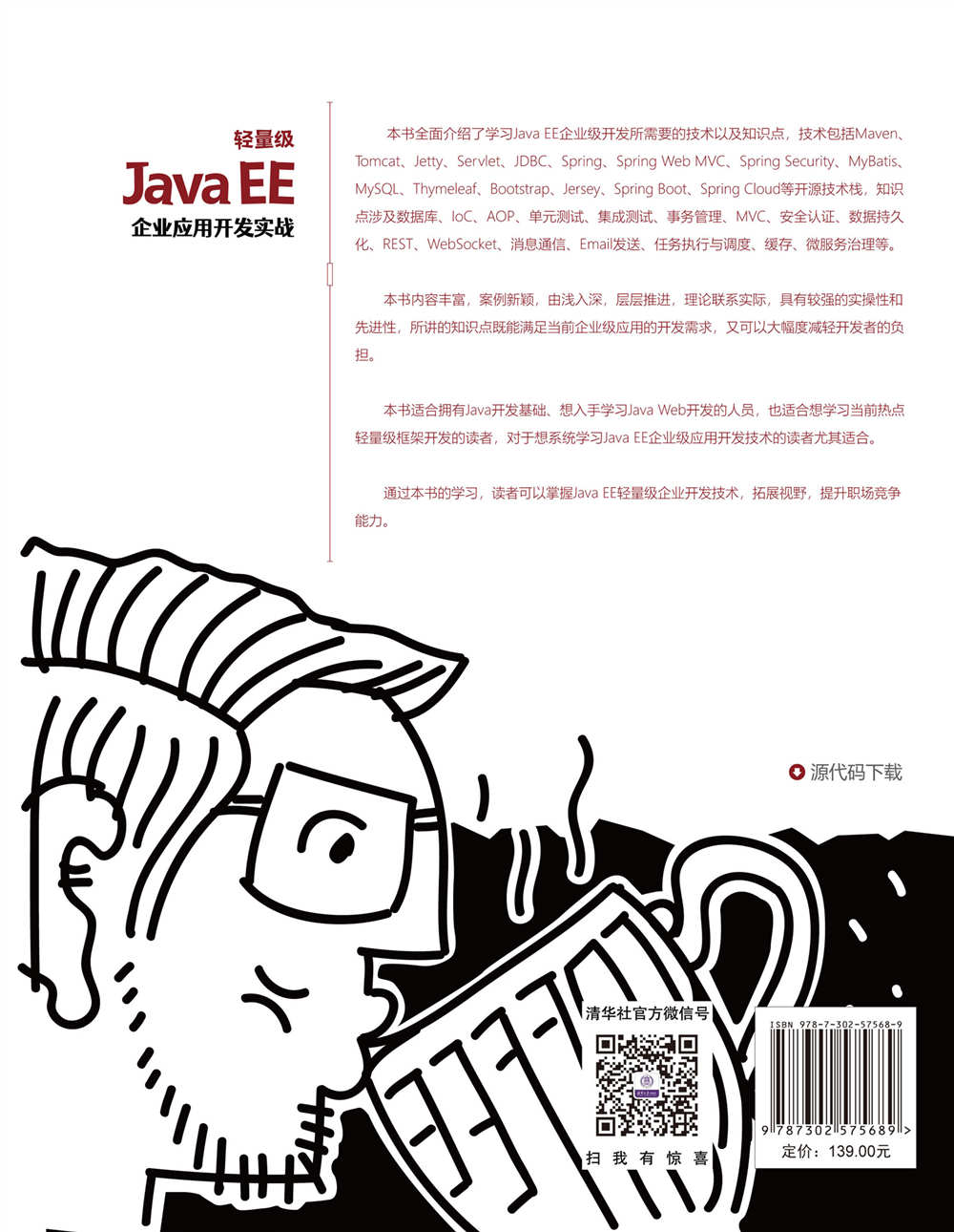 前 言 写作背景 随着云计算的普及、Cloud Native应用开发模式将会深入人心,这意味着未来的应用将会朝着快速迭代、分布部署、独立运行等方面发展,敏捷、轻量的框架也必将会受到更多开发者的青睐。这也是为什么传统的Java EE所提供的规范未被广大互联网公司所采用,反而是诸如Spring框架、Spring Web MVC、Spring Security、MyBatis等反传统的“轻量级”开发模式深入人心。所谓轻量,指的是抛弃墨守成规、面向规范的臃肿开发方式,转而采用开源的、重视解决具体问题的技术框架。 本书主要介绍Java EE企业级开发所需要的轻量级的开源技术栈,涉及Maven、Servlet、Jetty、Tomcat、Spring框架、Spring Web MVC、Spring Security、MyBatis、MySQL、Thymeleaf、Bootstrap、REST客户端、Jersey、WebSocket、JMS、Email、任务执行与调度、缓存、Spring Boot、Spring Cloud等方面的内容,这些都是当今互联网公司主流的应用技术,经受住了大规模商业实践的考验。本书内容编排由浅入深,案例丰富,特别适合基础薄弱或者缺乏实战经验的学生和软件开发人员阅读。 本书每章的最后都安排了一个“习题”环节,既是对当前章节的内容回顾,又可作为公司面试习题。 源代码下载 本书提供源代码下载,可以扫描以下二维码下载: 另外,也可以使用Github下载: https://github.com/waylau/java-ee-enterprise-de...