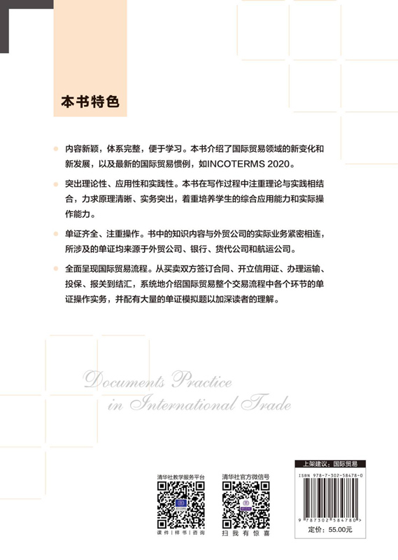 前 言 在当今的国际贸易实践中,从贸易磋商、合同的签订到最终货款结算的全过程,几乎都离不开单证工作。在单证工作中,稍有疏忽就会给对外贸易带来不应有的损失,甚至造成严重的后果,这对高校国际经济与贸易专业的教学提出了较高的要求,特别是对与单证工作密切相关的国际贸易单证实务操作的教学提出了更加严格的要求。 随着我国对外贸易的发展,银行单证结算部、外贸公司、货代公司、航运公司以及物流公司需要大量具有单证操作能力的专业人员。为适应这一需求,我们于2005年编写了《国际贸易单证实务》一书,得到了业界同仁和兄弟院校的肯定,该教材自出版至今,销量已突破了22万册。近年来,国际贸易和结算方面的国际惯例有了新的变化和发展,如国际商会 (ICC)修订的 《跟单信用证统一惯例》第600号出版物 (简称 UCP600)于 2007年7月1日生效;国际商会修订的INCOTERMS2020于2020年1月1日实施。另外,我国报检报关主管部门的合并也带来了相关政策内容的变化及报关与检验检疫流程方面的变化,如我国海关总署于2019年1月22日公告对 《中华人民共和国海关进出口货物报关单填制规范》予以修订,对报关单的填制内容进行了相应调整。 本版的篇目章节安排基本与第四版保持一致,主要在以下几方面对内容进行了修订:①全书涉及贸易术语部分均按照INCOTERMS2020版本进行了修改;②根据我国汇率的变化,对相关报价核算及计算部分进行了修订;③每章的本章要点、重要概念、重难点解析和习题详解可通过扫描各章后相应的二维码获取。 修订后的教材主要体现了以下特色:①突出理论性、应用性和实践性。注重理论与实践...