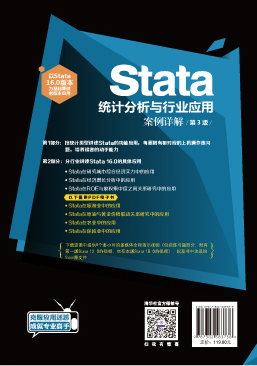 前 言 Stata是公认的应用广泛的专业数据分析软件之一,以功能丰富、效率高、操作简便而著称,主要针对经济、管理、医学、农学、教育、市场研究、社会调查等多个行业和领域。Stata的窗口具有亲和力,使用者自行建立程序时,软件能提供具有直接命令式的语法,是非常适合进行数据分析的工具软件。本书在前两版的基础上进行了软件版本升级,通过多个实例详细介绍Stata 16.0在现实生活中的应用。 全书共19章,分为如下两部分: 第1部分(第1~16章)为Stata的各个操作功能在具体实例中的应用。 ? 第1章介绍Stata 16.0基本窗口及管理变量与数据,包括Stata 16.0窗口说明、数据文件的创建与读取、创建和替代变量、分类变量和定序变量的基本操作、数据的基本操作以及定义数据的子集等。 ? 第2章介绍Stata图形绘制实例,包括直方图、散点图、曲线标绘图、连线标绘图、箱图、饼图、条形图、点图等。 ? 第3章介绍Stata描述统计实例,包括定距变量的描述性统计分析、正态性检验和数据转换、单个分类变量的汇总、两个分类变量的列联表分析、多表和多维列联表分析等。 ? 第4章介绍Stata参数检验实例,包括单一样本T检验、独立样本T检验、配对样本T检验、单一样本方差的假设检验、双样本方差的假设检验等。 ? 第5章介绍Stata非参数检验实例,包括单一样本的正态分布检验、两独立样本检验、两相关样本检验、多独立样本检验、游程检验等。 ? 第6章介绍Stata方差分析实例,包括单因素方差分析、多因素方差分析、协方差分析、重复测量方差分析等。 ? 第7章介绍Stata相关分析实...