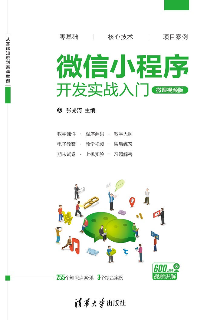 前言 微信小程序(Mini Program)是一种不需要下载安装即可使用的应用,它实现了应用的“触手可及”,用户扫一扫或搜一下即可打开应用。在第五届世界互联网大会上,微信小程序商业模式获选世界互联网领先科技成果。微信小程序在目前主流的前端技术基础上,提供了自己的框架和API,由于其与微信无缝结合,使得开发者能够快速开发出各种应用。目前微信小程序应用数量超过100万,覆盖200多个细分行业,日活用户达到2亿,已有150万开发者,这充分说明了小程序具有美好的未来。 本书是一本学习微信小程序开发的入门级教材,若读者已经有HTML、CSS、ES5或ES6和JavaScript方面的知识,则能更快地借助本书开启微信小程序开发之旅。为了能让使用本书的读者尽快上手微信小程序的开发,在设计和挑选教材内容时,有以下考虑。 (1) 本书第1章在简要介绍微信小程序的产生背景之后,针对初学者详细讲解了如何准备开发者账号; 如何搭建开发环境,包括微信开发者工具的下载、安装和使用; 如何创建一个微信小程序项目; 如何使用模拟器和真机调试并运行微信小程序项目; 最后介绍了微信小程序项目的目录结构。 (2) 本书第2章介绍小程序的框架,包括逻辑层和视图层两部分。在逻辑层主要描述了如何注册小程序、如何构造注册页面、什么是页面的生命周期,页面路由的管理、模块化的具体方法和API的分类; 在视图层中则主要涉及WXML、WXSS、WXS、事件系统和基础组件等方面的内容。尽管逻辑层和视图层中会涉及CSS、ES6或JavaScript方面的知识,但考虑本书的重点是微信小程序的开发,故未浪费篇幅介绍之,而是...