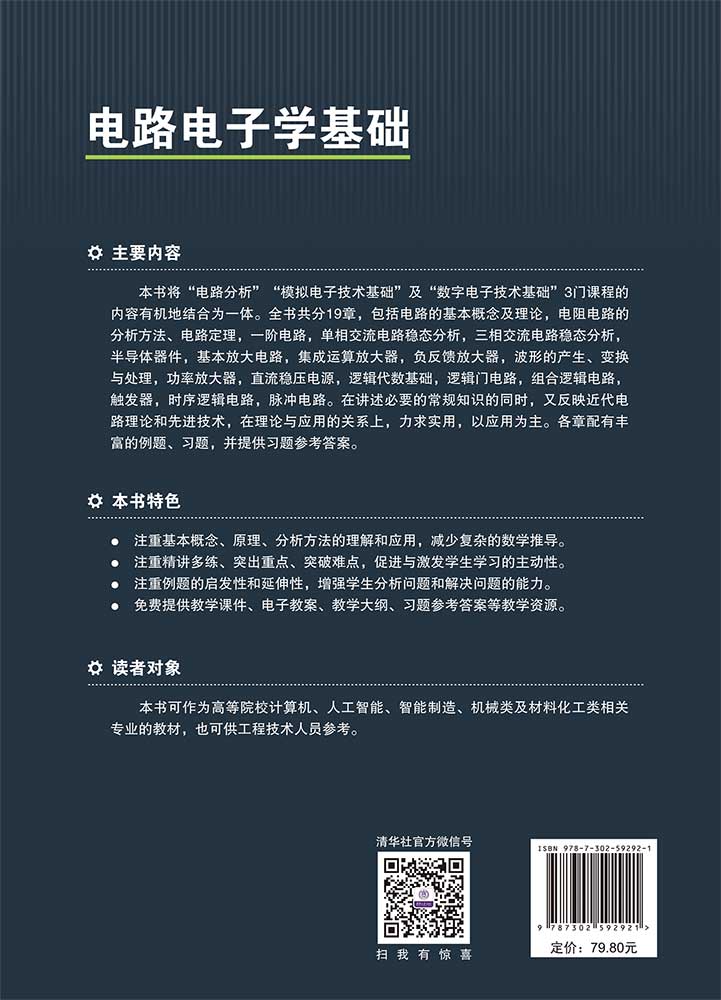 前 言 《电路电子学基础》根据教育部电子信息科学与电气信息类基础课程教学指导分委员会提出的《电路课程教学基本要求》《电子技术课程教学基本要求》,融合了各高校近年来教学改革的经验和作者多年的教学经验,并吸取各方面的建议和意见编写而成。《电路电子学基础》注重理论与实践相结合,力求将讲授与自学有机结合起来,启发学生思考,引导教学互动,提高教师教学效果和学生自主学习的效果。 全书共分19章,主要介绍了电路的基本概念及理论,电阻电路的分析方法,电路定理,一阶电路,单相交流电路稳态分析,三相交流电路稳态分析,半导体器件,基本放大电路,集成运算放大器,负反馈放大器,波形的产生、变换与处理,功率放大器,直流稳压电源,逻辑代数基础,逻辑门电路,组合逻辑电路,触发器,时序逻辑电路,脉冲电路等内容。各章节内容的选择上,突出重点,注重实践性和应用性。 每章先介绍本章主要内容,再进行主要内容的讲解,做到主要的知识点都有例题,详略处理得当,例题、习题配置齐全,难度适中,使得读者在学习过程中,既能学习理论知识,又可培养实践能力,知识点与例题有机结合,易于理解和掌握,符合学习和认知的基本规律。 《电路电子学基础》由李天利任主编,负责全书的架构、组织和统稿,第1章和第14章由陈蓓编写,第2章和第16章由吴彦锐编写,第3章和第15章由李霞编写,第4章由赵艳编写,第5章由张福才编写,第6章由兀旦晖编写,第7章由戴庆瑜编写,第8~10章由侯勇严编写,第11章由周晓慧编写,第12章和第13章由汤伟编写,第17~19章由李天利编写。张开生、辛登科和张玲仔细审阅了全书并提出不少宝贵的建设性意见。 《电路电子...