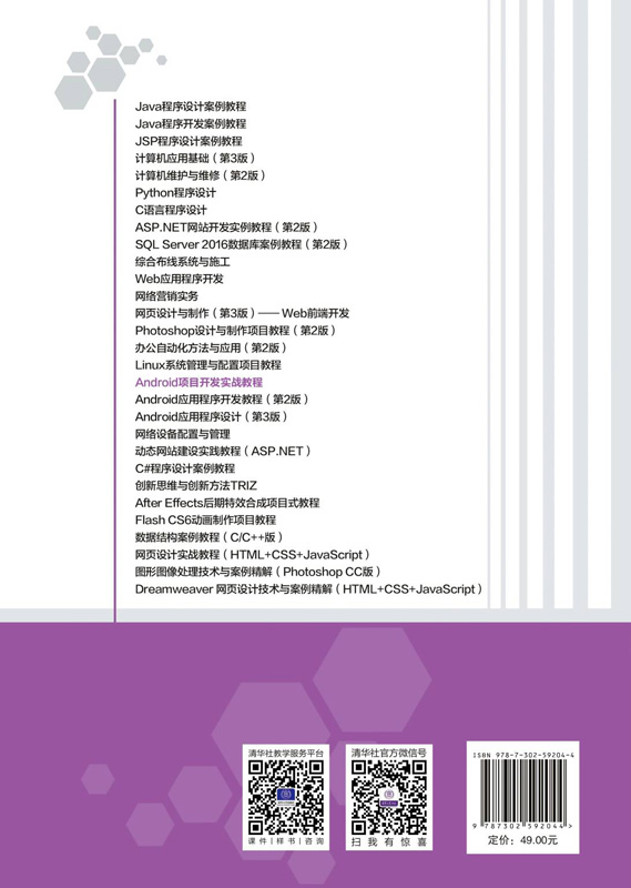 《Android 项目开发实战教程》是一部 Android 开发的实战教程,由浅入深、由基础到高级,涵盖 Android 应用开发的常见知识点,带领读者一步一步地掌握 Android 应用项目开发的方法。本书以新闻客户端项目为主线,从项目的需求分析、产品设计、产品开发到项目上线,讲解了项目开发的全过程。全书共分为 7 章。第 1 章针对项目进行整体介绍。第 2 章针对项目功能界面的设计进行讲解。第 3~6 章针对软件功能模块进行讲解,包括新闻模块、图片中心模块、推荐视频模块、“我”的界面模块。第 7 章针对项目上线进行讲解。 《Android 项目开发实战教程》适用于 Android 开发的程序员及从业者、有志于从事 Andriod 开发的业余爱好者,也可作为大中专院校与培训机构的 Android 课程教材。