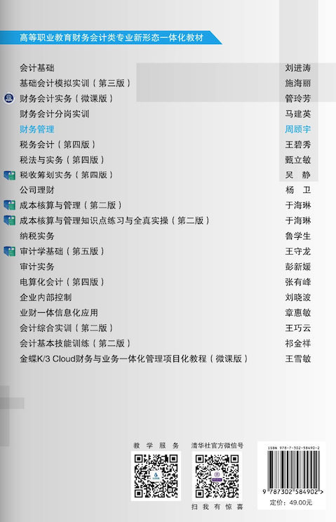 本书广泛吸取高职高专财务管理教学经验和教材建设成果,根据财务管理学科的新发展和高职高专应用型人才培养目标的要求编写。本书以企业财务管理工作过程为主线,以职业能力培养为宗旨,内容深入浅出,每一任务前有引导案例,每个项目后附有同步测试和实训项目,每个实训项目下分两项内容,一是“创业财务计划书的编制”;二是“结合课程项目内容进行的课后调研”,这两大实训内容是贯穿本书设计的一大特色,所有课程内容均围绕这两项工作任务展开,即以创业财务计划书为载体,并以分项目调研能力训练为补充,设计教学过程,教、学、做相结合,强化学生能力的培养,调动学生参与教学过程的积极性。 本书可作为高职高专院校、成人高校及本科院校举办的二级职业技术学院财经商贸大类相关专业的教学用书,还可作为财务从业人员掌握、提高财务管理知识与技能的自学用书。