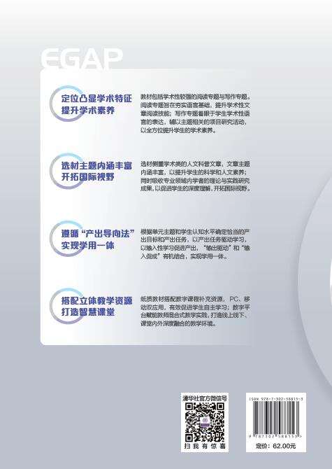 本书依据“产出导向法”的教学理论,将“输出驱动”和“输入促成”有机结合,以训练学生掌握各学科中通用的读、写等学术英语技能,开拓其国际视野。本书每个单元包括学术阅读和学术写作两大模块。学术阅读模块每单元围绕一个主题,包括教育、社会、心理、历史、经济和科技等各个方面,辅以多样化练习,由专项基础语言训练过渡到综合性学术能力训练;学术写作模块包括对写作技巧的介绍、结构分析,以及对例文的综合性解析,在此基础上引导学生进行写作输出训练。此外,本书学术阅读部分为“纸质教材+线上补充资源”模式,充分赋能教师的混合式教学实践,促进学生的自主学习。 本书的读者对象:普通高校硕士研究生,致力于提升自身学术能力的三、四年级本科生等。