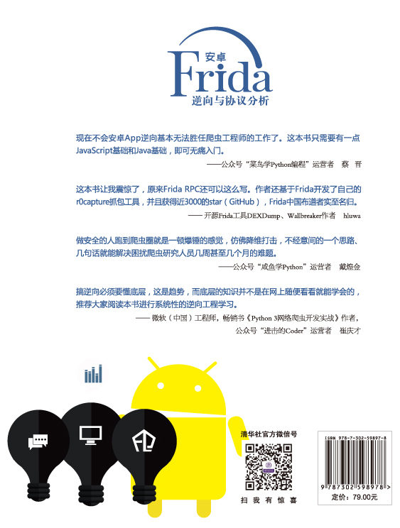 本书翔实地介绍流行的Frida工具在安卓逆向工程中的应用,内容包括:如何安装和使用Frida、基本环境的搭建、Frida-tools、Frida脚本、Frida API、批量自动化Trace和分析、RPC远程方法调用、在无须逆向算法具体实现的情况下对Frida工具的调用,并提供了大量App逆向与协议分析案例,书中还介绍了更加稳定的Xposed框架的使用方法,以及从安卓源码开始定制属于自己的抓包沙箱,打造无法被绕过的抓包环境等内容。 本书案例丰富,注重实操,适合安卓应用安全工程师、安卓逆向分析工程师、爬虫工程师以及大数据采集和分析工程师使用。