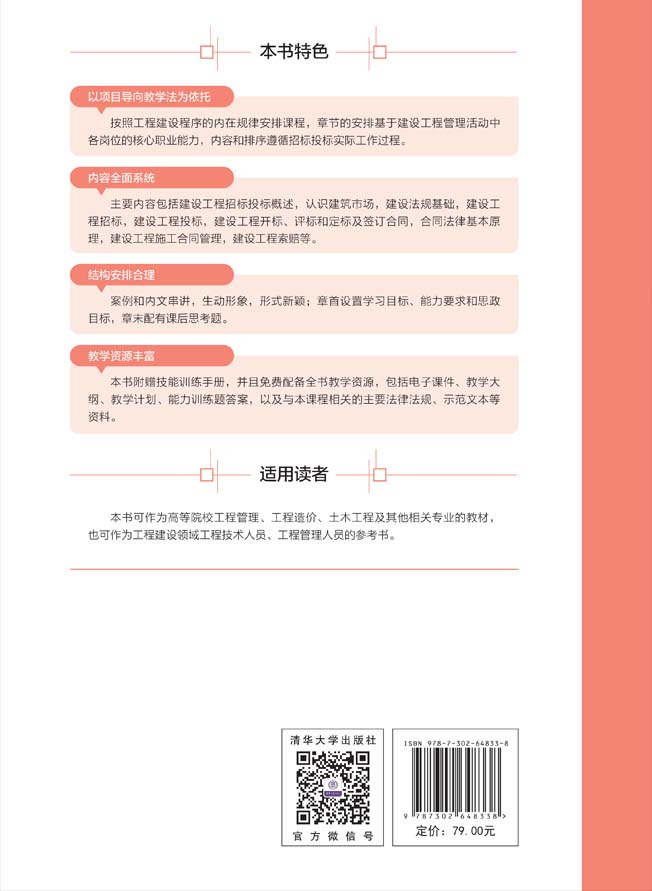 按照工程建设程序的内在规律安排课程,章节的安排基于建设工程管理活动中各岗位的核心职业能力,内容和排序遵循招标投标实际工作过程。
