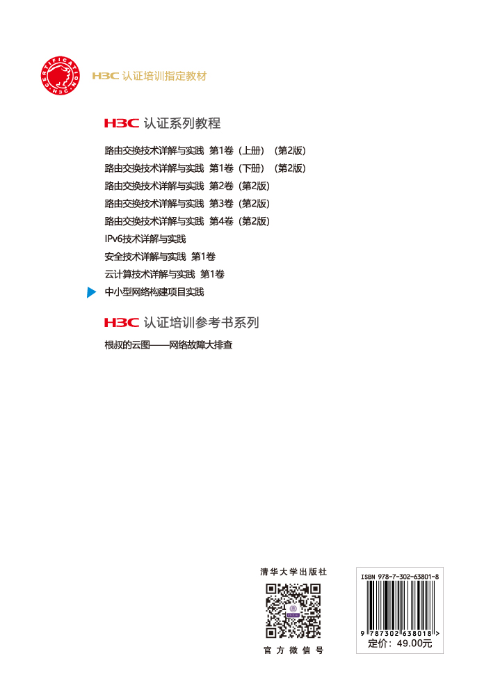 本书从简到难,以贴近实际网络的动手实验为主,配合通俗易懂、深入浅出的知识介绍,通过项目式教学的方式模拟实际网络工程项目,让读者能够学习到大量的H3C网络设备(路由器、交换机)配置及实施技能,包括网络设备的基本操作、VLAN配置、IP地址规划、STP配置、802.1x配置、路由协议配置、ACL配置、NAT配置、DHCP配置等。 本书适合作为高等院校、职业院校信息技术相关专业的教材,也适合具备一定IP网络基础知识,同时想要学习H3C网络知识并具有较强动手能力的读者自学使用。 本书封面贴有清华大学出版社防伪标签,无标签者不得销售。