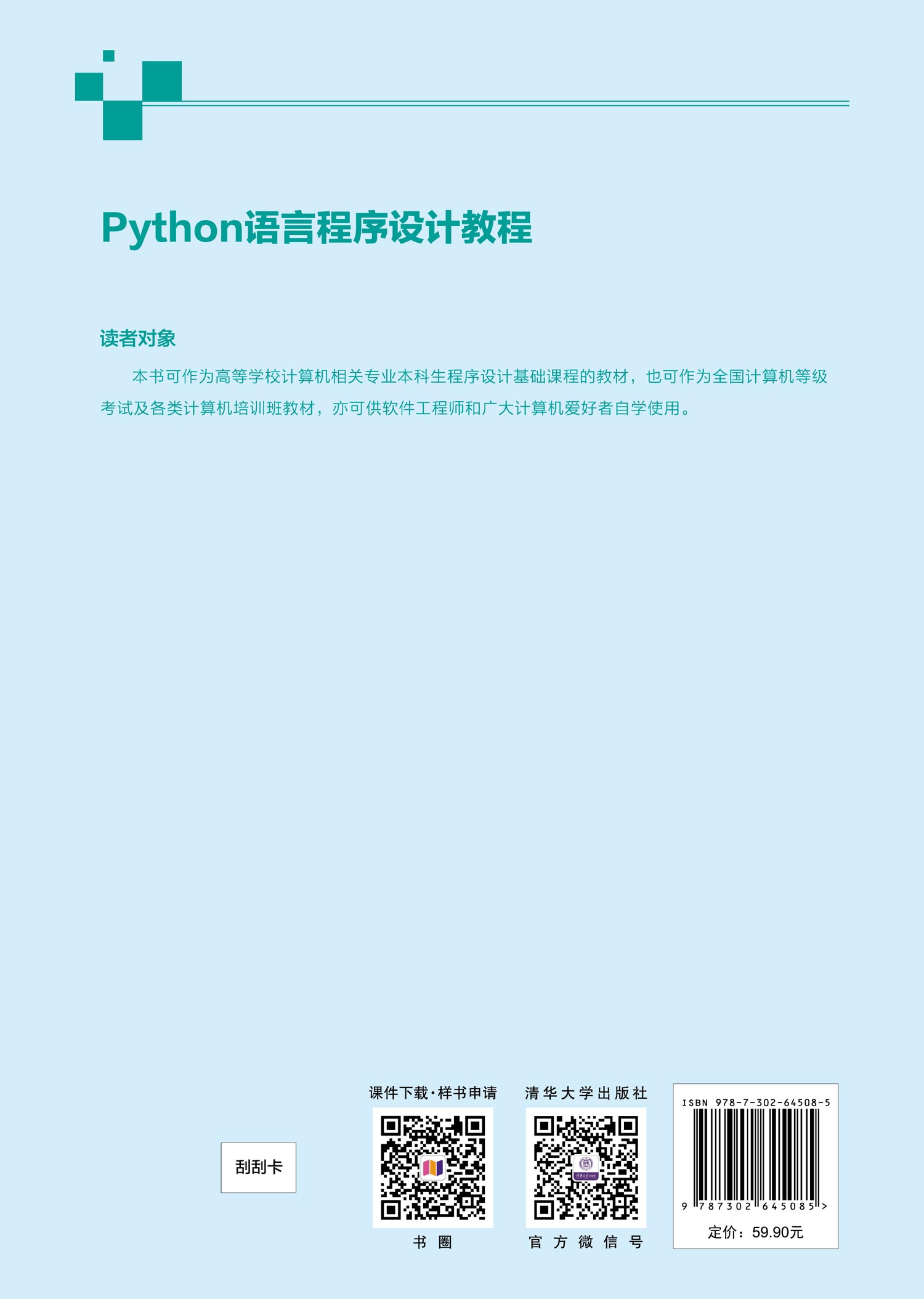 本书以程序设计为主线,以程序设计初学者为教学对象,系统讲解了Python语言的基础知识和实用工具。全书共12章,内容包括Python概述、Python语言基础、组合数据类型、程序控制结构、函数与模块、文件操作、面向对象程序设计、异常处理、Turtle绘制图形、Tkinter图形用户界面、科学计算与可视化、网络爬虫。本书每个知识点后都有相关编程实例,方便读者上机练习,把握Python语言的特点,启迪编程思维。 本书可作为高等院校计算机相关专业本科生程序设计基础课程的教材,也可作为全国计算机等级考试及各类计算机培训班教材,亦可供软件工程师和广大计算机爱好者自学使用。