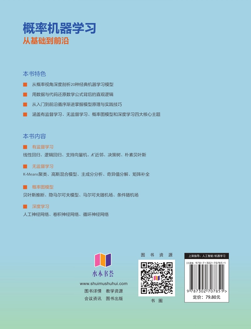 "机器学习是人工智能时代的核心技术之一。本书从概率视角出发,系统讲解常见机器学习模型的理论基础与实现方法,通过清晰的数学推导和简洁高效的代码示例,帮助读者循序渐进地理解机器学习的原理和方法,培养理论推理能力与实践动手能力。 全书共16章,涵盖有监督学习、无监督学习、概率图模型、深度学习四大核心主题,详细地介绍了线性回归、逻辑回归、支持向量机、K近邻、决策树、朴素贝叶斯、K-Means 聚类、高斯混合模型、主成分分析、奇异值分解、贝叶斯学习、概率图模型、隐马尔可夫模型、马尔可夫随机场、条件随机场、人工神经网络、卷积神经网络、循环神经网络等经典模型,并辅以详尽的数学推导与代码实现。 本书贯彻“代码驱动”的教学理念,以丰富的实例深入解析复杂的机器学习原理,通过案例实践强化读者的工程实践能力。本书适合作为人工智能、智能科学与技术、计算机等相关专业的高年级本科生和研究生教材,也可供机器学习工程师、数据科学家及行业从业者参考学习。 "
