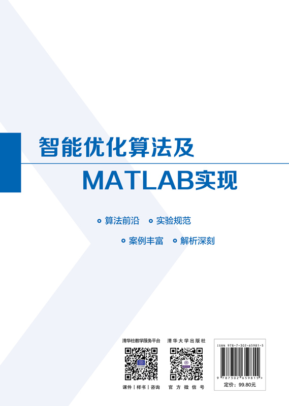 智能优化算法作为人工智能的重要研究方向之一,为许多领域中复杂的系统优化问题提供了更好的 解决方法,因此得到了广泛的应用。《智能优化算法及 MATLAB 实现》按照智能优化算法、测试函数集及常用仿真实验等逻辑脉络由 浅至深地进行讲解,便于读者入门并掌握智能优化算法及其 MATLAB 实现的相关知识,为后续学习打 下良好基础。全书共 16 章,第 1 至 13 章分别介绍了 13 种智能优化算法的基本原理、流程图、MATLAB 实现和应用案例;第 14 章介绍了 4 套常见的标准测试函数及其 MATLAB 实现;第 15 章介绍了 6 个典 型的工程设计问题及其 MATLAB 实现;第 16 章介绍了统计校验指标及代码。 《智能优化算法及 MATLAB 实现》既可作为人工智能、计算机科学与技术、电子信息、控制科学与工程等相关专业本科生和研究 生的教材,也可作为从事智能优化算法研究与应用的科研人员或技术人员的参考用书。
