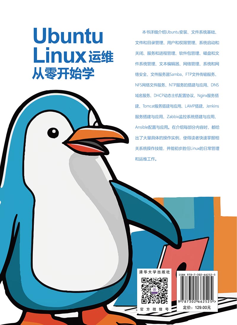 《Ubuntu Linux运维从零开始学》详解Ubuntu安装、文件系统基础、文件和目录管理、用户和权限管理、系统启动和关闭、服务和进程管理、软件包管理、磁盘和文件系统管理、文本编辑器、网络管理、系统和网络安全、文件服务器Samba、FTP文件传输服务、NFS网络文件服务、NTP服务的搭建与应用、DNS域名服务、DHCP动态主机配置协议、Nginx服务搭建、Tomcat服务搭建与应用、LAMP搭建、Jenkins服务搭建与应用、Zabbix监控系统搭建与应用、Ansible配置与应用。"