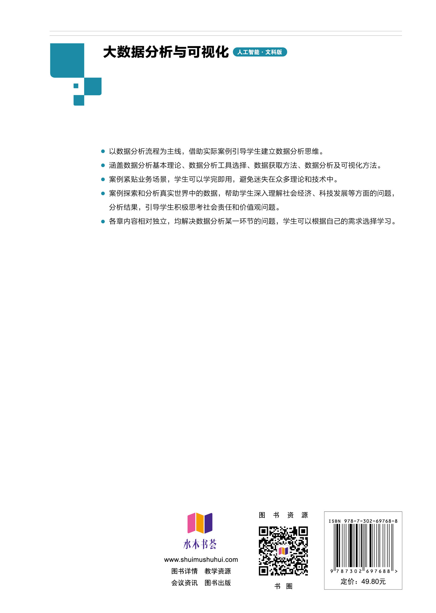 "本书以数据分析流程为主线,借助实际案例,引导读者建立数据分析思维,内容涵盖数据分析基本理论、数据分析工具选择、数据获取方法、数据分析及可视化方法。本书案例紧贴业务场景,读者可以学完即用,避免因迷失在众多理论和技术中而难以入手。本书案例探索和分析真实世界中的数据,帮助读者深入理解社会经济、科技发展等方面的问题,以分析结果引导读者积极思考社会责任和价值观问题。本书各章内容相对独立,旨在解决数据分析某一环节的问题,读者可以根据自己的需求选择性地学习。每章内容分为学习目标、案例知识点讲解、本章小结、思考与练习四部分,目标明确、内容完整。 本书适合作为高等学校文科类专业计算机相关课程的教材。 "
