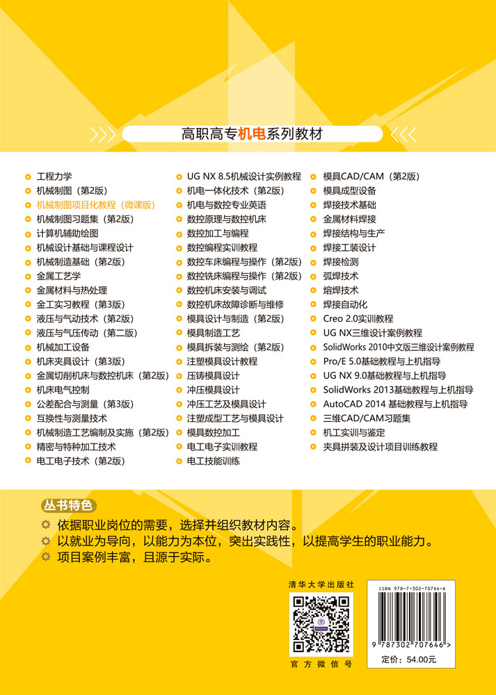 "《机械制图项目化教程(微课版)》构建了以学习任务为主线的教材组织结构,把“教材”变成“学材”,体现了以学生为主体,教师主导的教学模式,助推“三教”改革,利用信息化技术,使教材“立起来”, 对接“1+X”技能等级证书,课证融合,赛训一体,校企合作,共同完成编制。