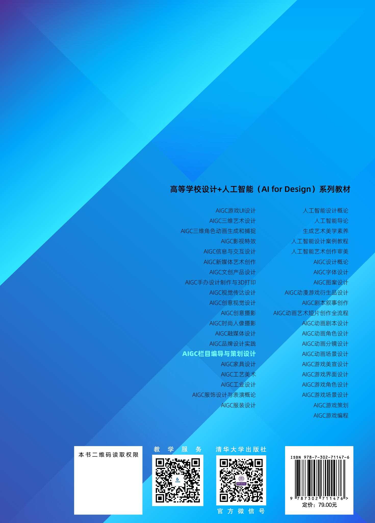 "《AIGC栏目编导与策划设计》是非常实用的教材,这本书涵盖了生成式人工智能的基础知识、应用领域以及在栏目编导与策划设计中的具体应用。书中不仅介绍了理论性的知识,还提供了很多实用的工具和方法。并且通过丰富的案例和实践操作,使学习者可以通过这些方法和技巧将生成式人工智能应用于自身栏目策划与编导实践中,从而提升效率和创造力。无论你是想深入了解生成式人工智能技术在栏目编导与策划中的应用技巧还是想通过人工智能技术在栏目编导与策划设计领域进行创新,都可以从这本书中得到答案。