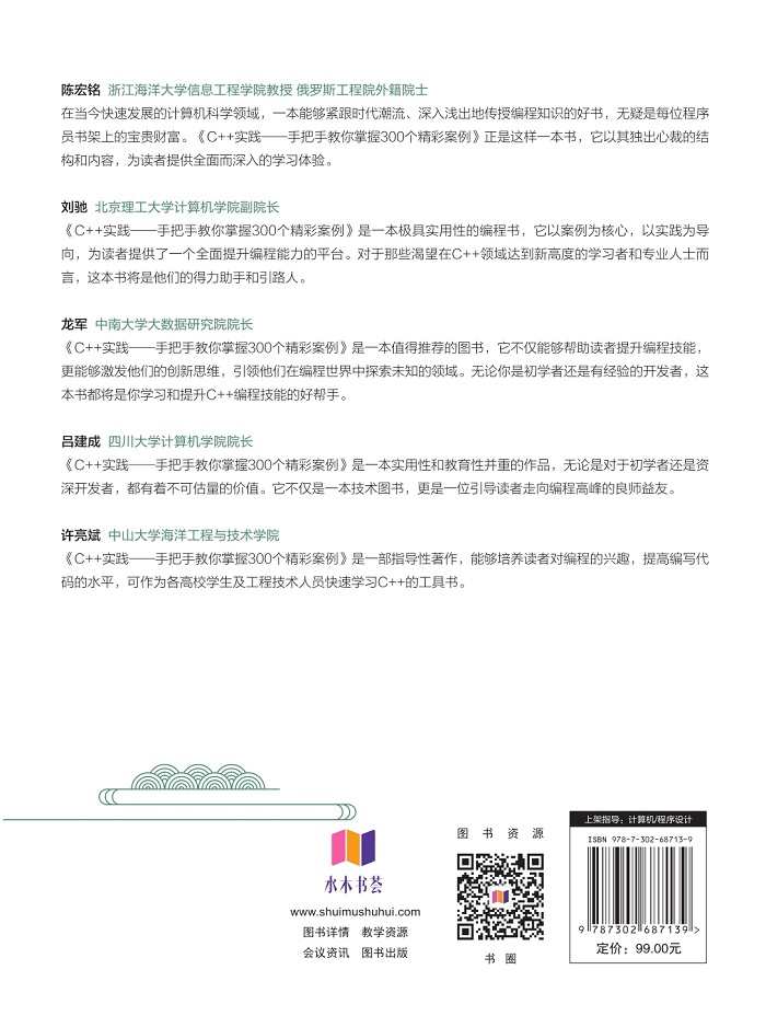 前言 C++作为一种多范式、静态类型的编程语言,以其卓越的性能和强大的抽象能力在软件开发及计算机科学的广阔天地中占据了举足轻重的地位。它巧妙地融合了C语言的高效性与面向对象编程的灵活性,成为横跨系统软件开发和复杂应用程序开发领域的得力助手。 本书的问世,旨在响应当代教育改革的呼声,强调实践教学的重要性,并致力于培养读者的创新能力。作者汇集了众多优秀教材之精华,精心挑选了300个充满趣味且实用性强的编程实例,期望能够激发教育领域的新思路,引领读者进入更深层次的探索。 书中内容的灵感和素材主要汲取自九章算法、LintCode和LeetCode等知名编程平台,确保了案例的实用性和前瞻性。 本书不仅为广大渴望提升C++编程技能的开发者提供了宝贵的学习资源,也为科研机构的研究人员和企业界的工程师提供了实用的技术参考。我们坚信,通过这300个精彩案例的深入学习,读者将在C++编程的征途上迈出坚实的步伐,无论是在学术探索还是在工业实践中,都能够更加自信地迎接和克服编程中的各种挑战。 本书的编写得到了信息工程专业国家第一类特色专业建设项目、信息工程专业国家第二类特色专业建设项目、教育部CDIO工程教育模式研究与实践项目、教育部本科教学工程项目、信息工程专业北京市特色专业建设、北京市教育教学改革项目的大力支持,在此表示感谢! 鉴于作者的经验和水平有限,书中难免存在疏漏和不足之处。我们诚挚地欢迎广大读者提出宝贵的意见和建议,以及具体的改进措施,以便我们能够不断修正和完善本书,共同推动C++编程教育的发展。 李永华于北京邮电大学2025年3月 ...