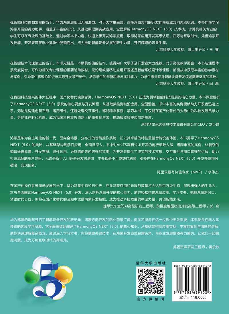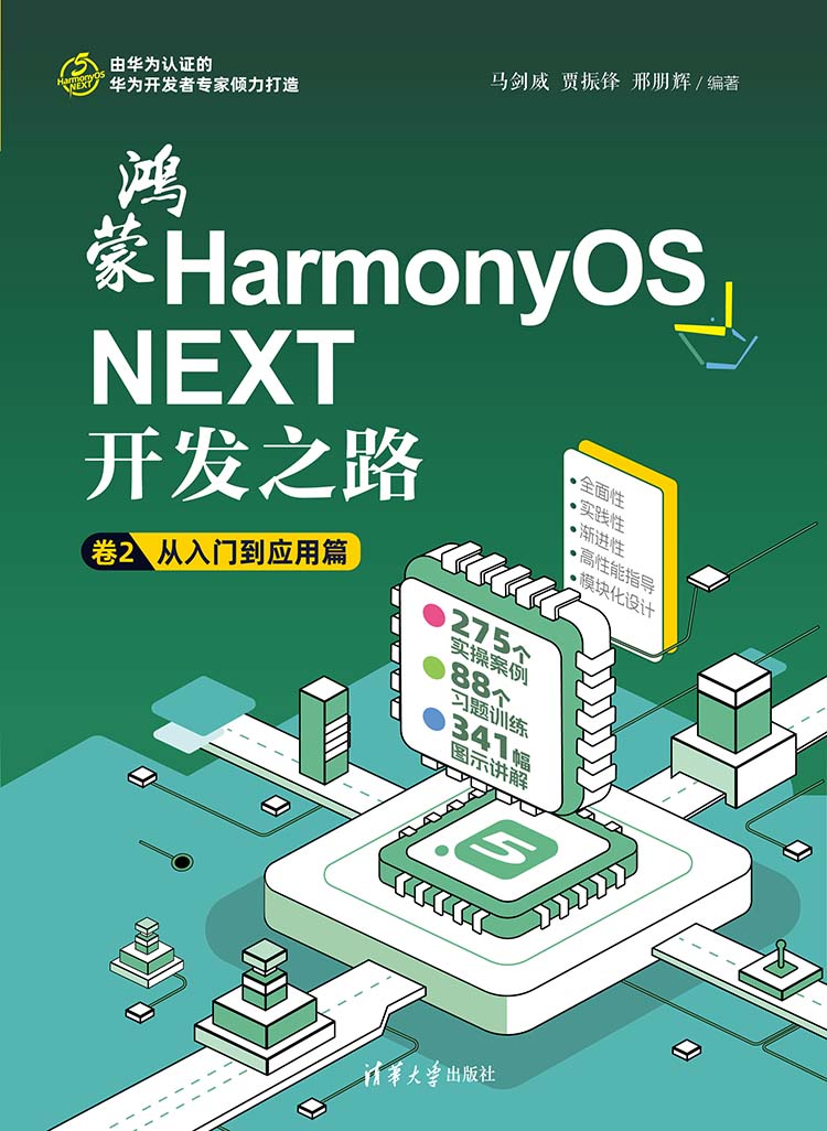 "《鸿蒙HarmonyOS NEXT开发之路 卷2:从入门到应用篇》是一本深度聚焦HarmonyOS NEXT应用开发的全方位指导书,内容遵循由浅入深的原则展开。全书分为基础知识、应用开发进阶和应用开发高级三部分。基础知识部分全面介绍HarmonyOS NEXT及其ArkTS声明式UI开发规范的核心内容与应用,涵盖开发环境搭建、开发布局、常用组件、导航、路由、交互事件、窗口管理和ArkWeb等核心要素,并辅以大量实操案例,助力读者迅速掌握开发要领。应用开发进阶部分深入探讨HarmonyOS NEXT中的动画与网络服务,为开发者提供实用的开发技能和优化应用体验的方法。应用开发高级部分详细介绍一多开发和第三方库的使用,最后介绍如何运用uni-app快速构建鸿蒙应用。 《鸿蒙HarmonyOS NEXT开发之路 卷2:从入门到应用篇》实例丰富、详实,无论是初学者还是有经验的开发者,都能从中获取系统全面的知识和极具实用的开发技巧,为开发出卓越的鸿蒙原生应用掌握关键技能。"
