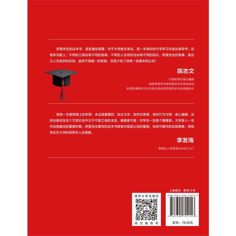 "1.这本书的诞生源自一个深刻的教育痛点—在中国,几乎所有的努力都集中在实现高考金榜题名上,然而在考上大学之后,虽然学校和社会也投入了大量的资源对大学生涯规划与未来发展进行指导,但许多学生仍感到无所适从,仍然缺乏清晰、可落地的行动指引。学生们走进大学,面临选择的迷茫与焦虑,而毕业时才发现理想与现实之间的巨大落差。 2.这并不是学生的错,事实上,几乎没有人教会他们如何规划自己的大学生活与职业生涯,尤其是在现代社会,随着全球化与科技变革,单纯的学术成绩和一纸学历已无法保证未来的成功,学生们急需一种更加全方位的规划和思维。
