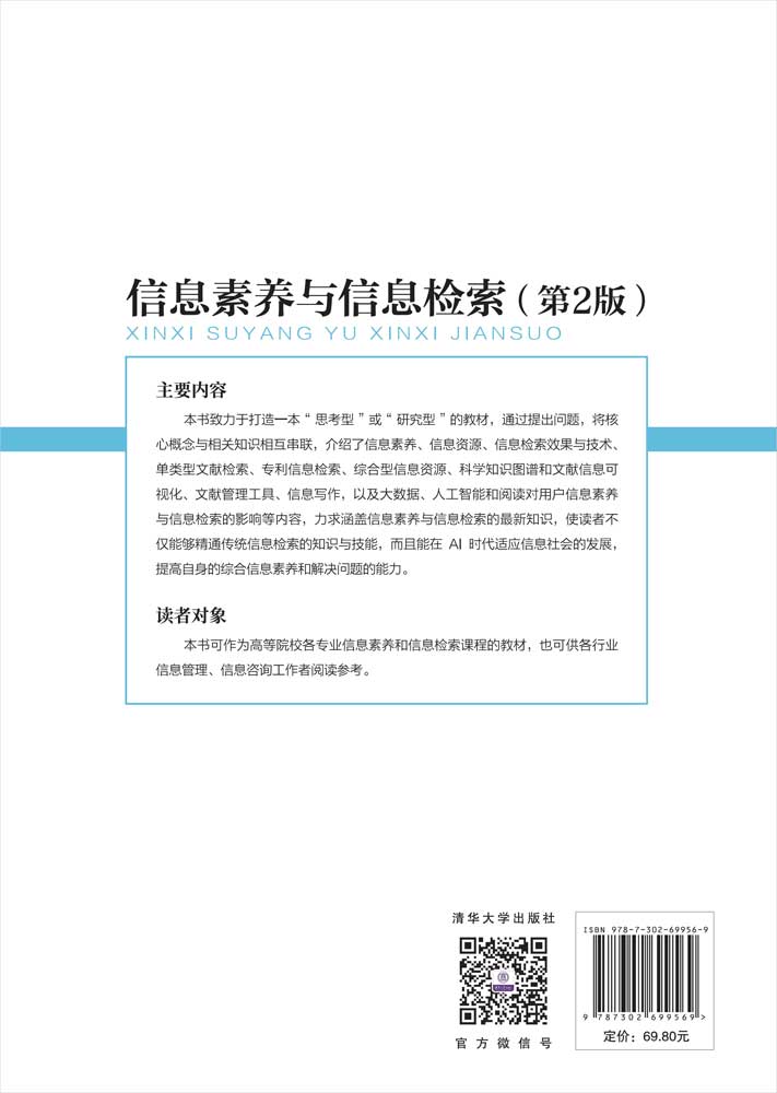 "《信息素养与信息检索(第2版)》主要介绍信息素养、各类型信息资源的检索与分析。本书广泛收集资料,并结合信息技术、数据库功能、信息分析等,力求涵盖信息素养与信息检索的**知识。 全书共10章。第1章至第4章介绍信息素养、信息资源、信息检索效果与技术、单类型文献检索等内容,使读者可以在充分了解信息素养的情况下,开始以信息检索为辅的初步学习和研究;第5章至第9章介绍专利信息检索、综合型信息资源、科学知识图谱和文献信息可视化、文献管理工具、信息写作等内容,更专业和深入,增加了信息检索的难度、信息分析的比重,完成从信息检索、分析到写作的过程;第10章重点介绍大数据、人工智能和阅读对用户信息素养与信息检索的影响等。 本书可供高等院校各专业本科生和研究生学习使用,也可供各行业信息管理、信息咨询工作者阅读参考。"
