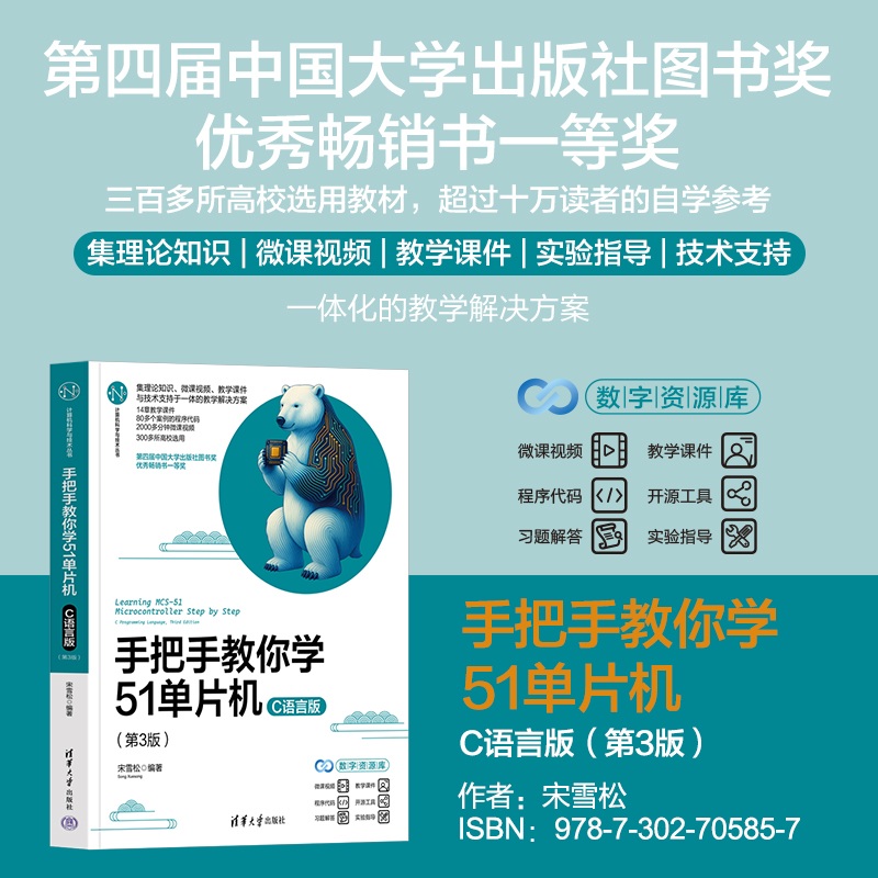 前言 为什么要写这样一本书? 单片机技术是现代工业自动化、电子电气、通信及物联网等领域的一门主流技术。随着人们生活及生产方式的自动化、智能化程度越来越高,单片机技术逐渐融入人们日常生活的每个角落,绝大部分的家电内部可见单片机的身影,无数自动化及智能公共设施的背后也都离不开单片机兢兢业业的工作。同时,单片机技术也是学习嵌入式系统、FPGA设计等更高阶技术的基础。 很多学生想学好单片机技术,看了不少书,也付出了很多的努力,但总感觉似懂非懂,遇上具体项目也很茫然而无从入手。目前,市面上关于单片机开发的书籍有很多,但大部分书籍要么过于理论化,全是架构讲述和汇编指令等,学生学了半天仍不知单片机为何物; 要么只有一些很简单的小实验,不涉及C语言指针,综合实践的例子更是一个没有,学生学完也只能做到点亮小灯、显示数字等。因学完这类教材后无法深入探索下去,很难将所学知识跟实际项目开发衔接起来,于是学生可能会怀疑自己的能力,认为自己不适合学习单片机。 从编者多年从事单片机领域的工作经验来说,单片机技术并不难掌握。在外行人看来,单片机可能挺神秘,但其实主要是没人帮忙去点破各种缘由,学不会的主要原因是方法不对,没有专业的人员带领大家入门。 基于这些原因,编者编写了这本《手把手教你学51单片机——C语言版》(第3版),并且提供了配套的教学课件、程序代码、微课视频和实验开发板(详情浏览青岛金思特电子有限公司(原金沙滩工作室)官方网站),手把手地带领大家学习单片机技术,给单片机初学者带来福音,让大家一步一个脚印地掌握单片机技术。 《手把手教你学51...