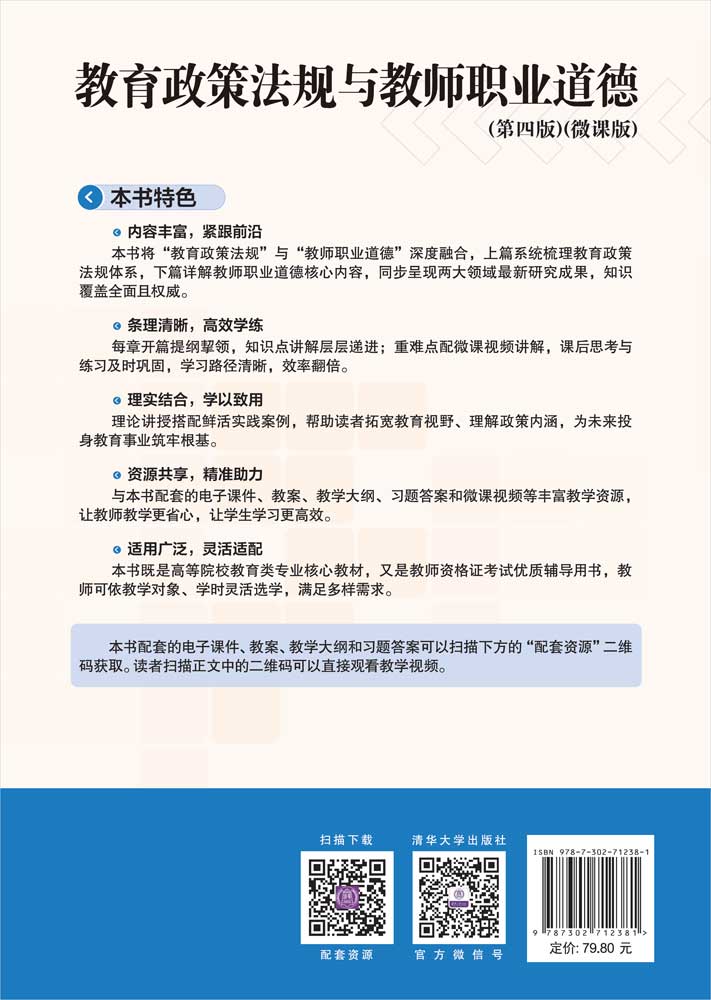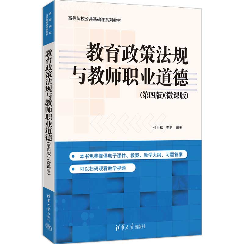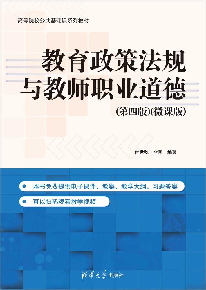 "《教育政策法规与教师职业道德(第四版)(微课版)》由“教育政策法规”和“教师职业道德”两部分构成,全书分为上、下两篇。“教育政策法规”部分系统介绍了教育政策、法规的基础知识和基本理论,反映教育政策、法规理论研究的新进展和新成就;实现教育政策、法规理论研究与实践研究的有机结合;结合教育政策、法规的专题分析,解读现行教育法律。“教师职业道德”部分以世界教育发展的大趋势为宏观背景,以我国教育改革发展为现实环境,借鉴教育学、伦理学等相关学科的基本理论,吸收国内外教师职业道德的**研究成果,对教师职业道德进行了较为深刻、系统的阐述。 本书的知识体系清晰合理,逻辑结构严密,理论知识介绍的程度适中,理论与实践案例的结合较为恰当。本书在讲授教育政策法规等理论知识的基础上,深入分析教师职业道德的具体表现和要求,同时,配合案例和课后习题等进行综合梳理,有助于应用型本科人才的培养。 本书配套的电子课件、教案、教学大纲和习题答案可以通过扫描前言中的“配套资源”二维码获取。读者扫描正文中的二维码可以直接观看教学视频。"
