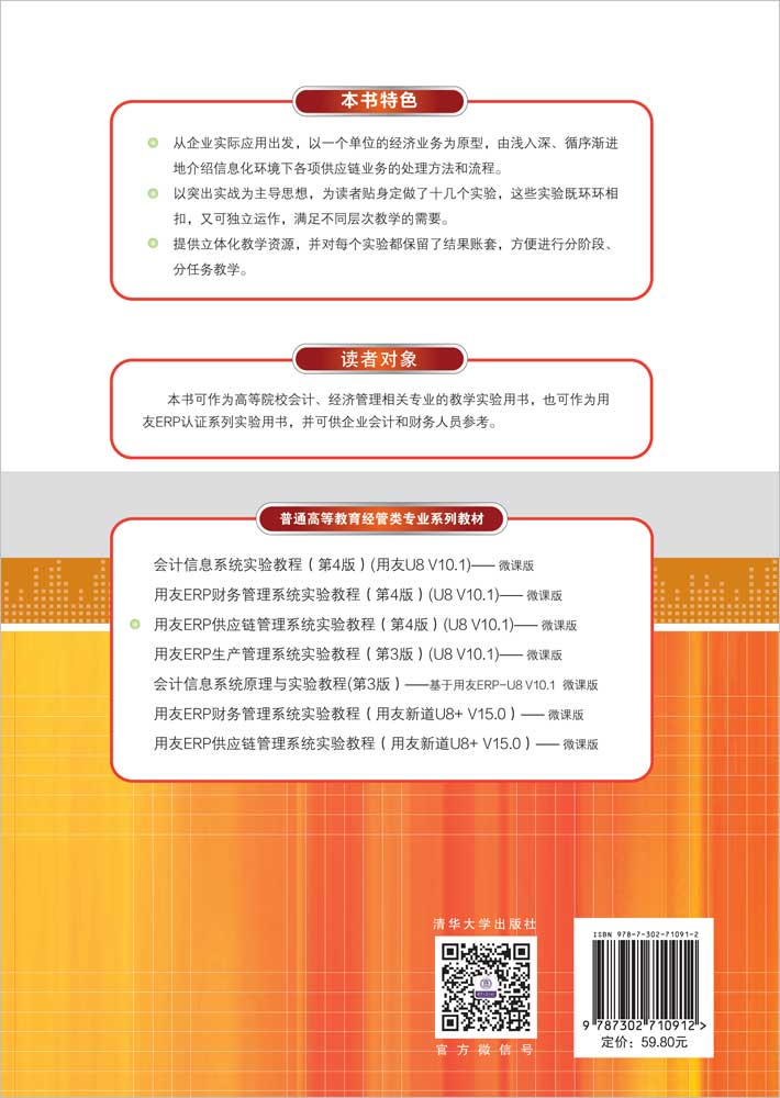 "?从企业实际应用出发,以一个单位的经济业务为原型,由浅入深、循序渐进地介绍信息化环境下各项供应链业务的处理方法和流程。
