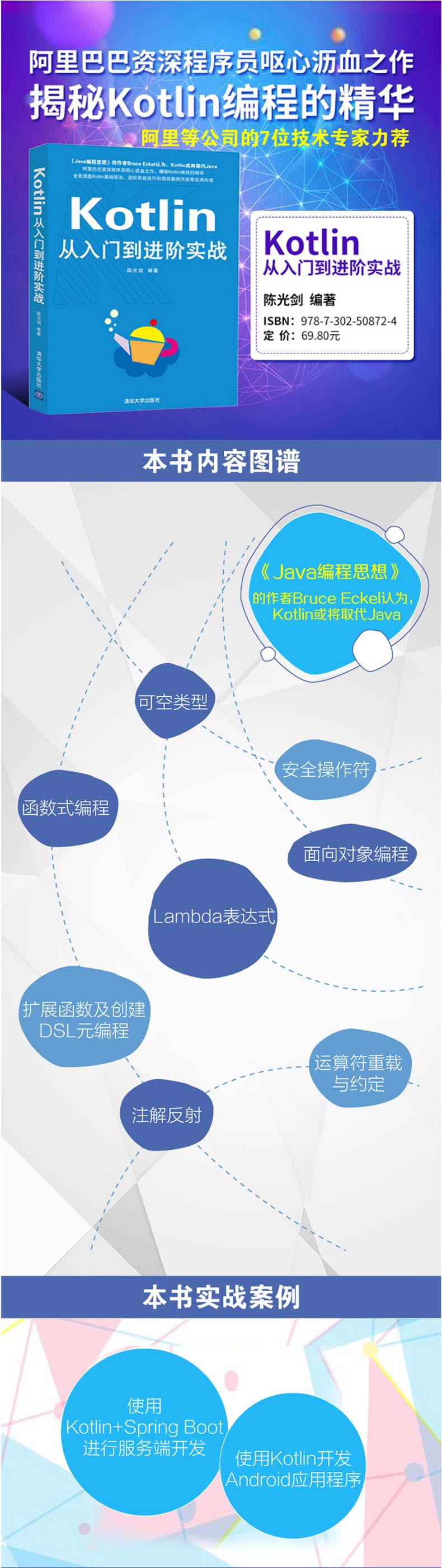 《Kotlin从入门到进阶实战》重点介绍了Kotlin语言的特性,包括可空类型、安全操作符、面向对象编程、Lambda表达式、函数式编程、扩展函数及创建DSL等,并都给出了丰富的代码示例。
