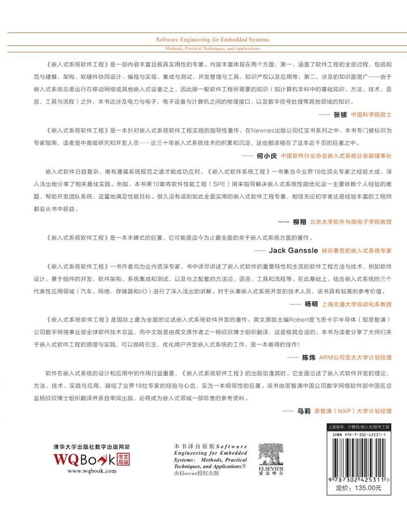 嵌入式系统在最近几年中得到了迅速发展和广泛应用。这对嵌入式软件的可靠性、稳定性、鲁棒性和性能都提出了更高的要求,对嵌入式软件的开发也提出了新的挑战。本书讲述了嵌入式软件的重要特性和软件工程方法,例如软件设计、基于组件的开发、软件架构、系统集成和测试,以及与之配套的方法论、语言、工具和流程等。它几乎涵盖了嵌入式软件开发的所有方面,包括建模、软/硬件协同设计、操作系统、编程规范、性能与优化、集成测试、质量控制、多核软件、知识产权与项目管理等主要问题。书中列举了存储与I/O、Linux与开源软件,以及面向网络和汽车的应用,最后的实例研究更可以帮助读者加深对嵌入式软件的理解。书中各章所描述的问题都是在嵌入式软件开发过程中常见的问题,每章都有对各自问题的背景介绍、问题求解以及实例和总结。这些章节各自独立,层次分明,既自成体系又互相联系。本书力求理论与实践紧密结合,内容翔实、实例丰富。本书可以作为高等院校“嵌入式软件”课程的教材,也可供从事嵌入式系统开发与应用的工程技术人员自学与参考。