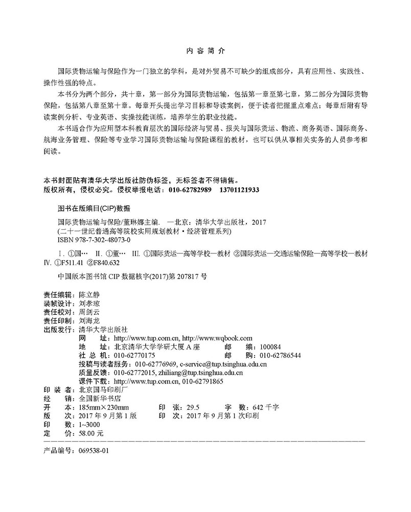 (1) 本书重点在于培养学生的实践能力和创新能力。基础理论贯彻“实用为主、必须和够用为度”的原则,基本知识遵循广而不深、点到为止的原则,基本技能则贯穿本书的始终,在每章的最后还有创新能力的培养环节。(2) 本书增加了“国际货运地理”,并在部分章节中增加了“国际货运代理”的相关内容,这是依据最新的国际货运惯例而增加的新内容。(3) 本书的可读性很强。每章之前都有学习目标、导读案例,书后又附有大量的专业英语、实际操作题,以供读者正确理解和巩固相关知识。本书共十章,分为两个部分,第一部分为国际货物运输,主要介绍国际海上货物运输、集装箱运输、国际铁路货物运输、国际航空货物运输的操作程序、有关问题及相关的国际贸易惯例,同时在这一部分增加了国际货运地理的基础知识;第二部分为国际货物保险,主要阐述国际货物运输保险的基本知识、业务程序以及应注意的问题。为了方便学生学习,掌握每章的知识重难点,本书在每章开始设有学习目标、导读案例,章后设有导读案例分析、本章小结。同时,为了加强学生对知识的准确理解和融会贯通,提高解决实际问题的能力,每章后还设置了专业英语、技能训练,以适应应用型本科教育层次的需要。