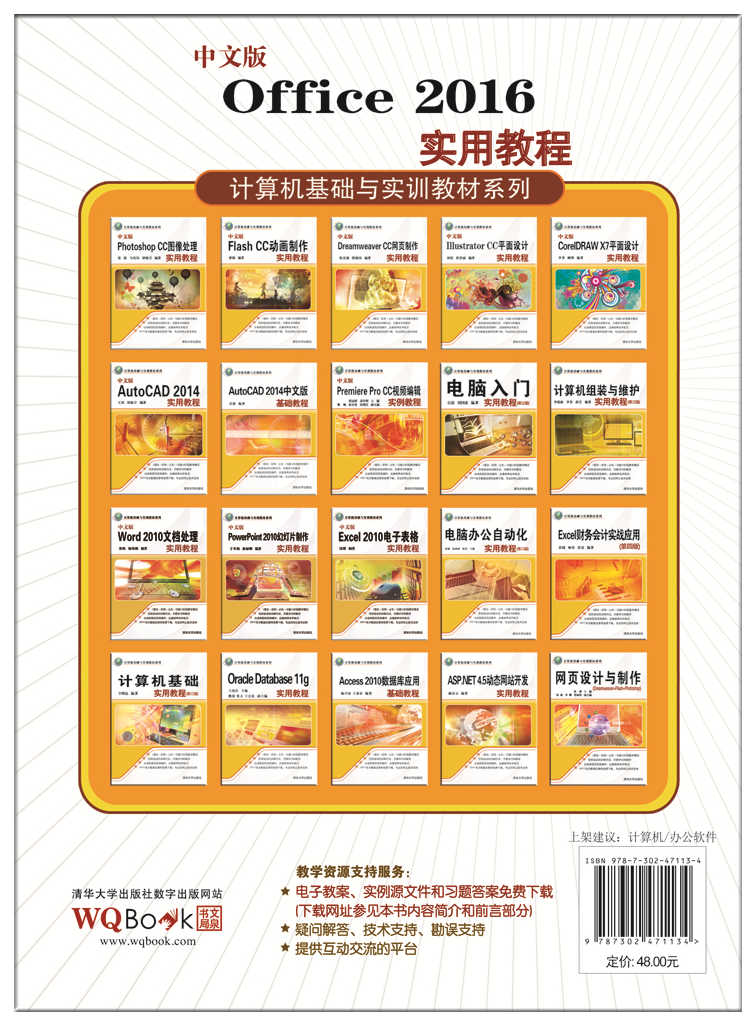 本书图文并茂、条理清晰、通俗易懂、内容丰富,在讲解每个知识点时都配有相应的实例,方便读者上机实践。同时在难于理解和掌握的内容上给出相关提示,让读者能够快速地提高操作技能。此外,本书配有大量综合实例和练习,让读者在不断的实际操作中更加牢固地掌握书中讲解的内容。为了方便老师教学,我们免费提供本书对应的电子教案、实例源文件和习题答案,您可以到清华大学出版社网站的相关页面上进行下载。(下载地址见书版权页)