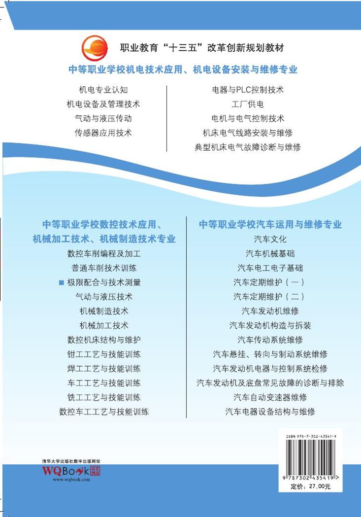 本书是中等职业教育“十三五”改革创新规划教材,依据教育部2014年颁布的《中等职业学校数控技术应用专业教学标准》中“极限配合与技术测量”课程的“主要教学内容和要求”,并参照相关国家职业技能标准编写而成。 本书主要内容包括绪论、测量技术基础、极限与配合、几何公差及其检测、表面结构要求、尺寸链、常见零件的公差与配合。本书配套有电子教案、多媒体课件等丰富的网上教学资源,可免费获取。 本书可作为中等职业学校机械加工技术、机械制造技术、数控技术应用专业及相关专业学生的教材,也可作为岗位培训用书。