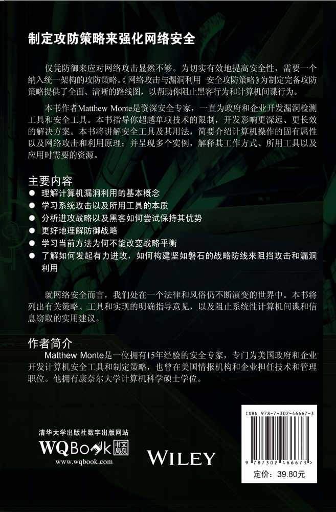 制定攻防策略来强化网络安全 仅凭防御来应对网络攻击显然不够。为切实有效地提高安全性,需要一个纳入统一架构的攻防策略。 网络攻击与漏洞利用 安全攻防策略 为制定完备攻防策略提供了全面、清晰的路线图,以帮助你阻止黑客行为和计算机间谍行为。 本书作者Matthew Monte是资深安全专家,一直为政府和企业开发漏洞检测工具和安全工具。本书指导你超越单项技术的限制,开发影响更深远、更长效的解决方案。本书将讲解安全工具及其用法,简要介绍计算机操作的固有属性以及网络攻击和利用原理;并呈现多个实例,解释其工作方式、所用工具以及应用时需要的资源。 主要内容 ● 理解计算机漏洞利用的基本概念 ● 学习系统攻击以及所用工具的本质 ● 分析进攻战略以及黑客如何尝试保持其优势 ● 更好地理解防御战略 ● 学习当前方法为何不能改变战略平衡 ● 了解如何发起有力进攻,如何构建坚如磐石的战略防线来阻挡攻击和漏洞利用 就网络安全而言,我们处在一个法律和风俗仍不断演变的世界中。本书将列出有关策略、工具和实现的明确指导意见,以及阻止系统性计算机间谍和信息窃取的实用建议。
