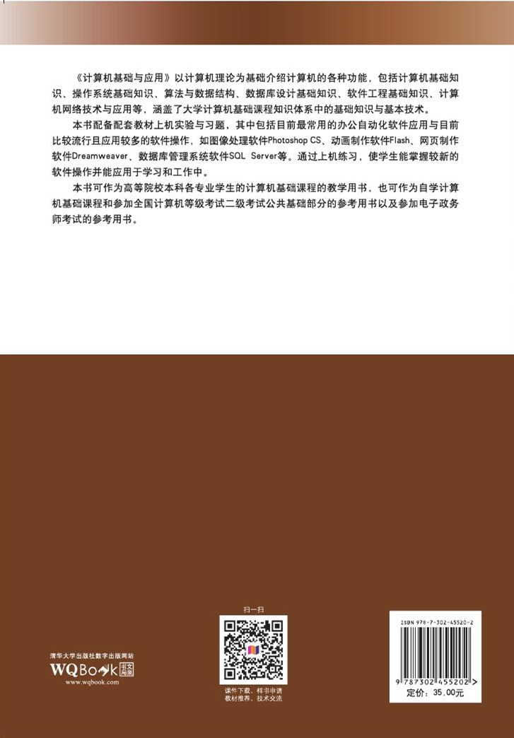 前言 计算机基础与应用本书是结合大学计算机基础课程教学改革实践而编写的。目前我国大学生的计算机基础不尽相同,因此,在大学中计算机基础教学内容的设置显得尤为重要。本书的教学内容紧跟计算机发展形势与学生应用和就业的需要,理论教学强调学生掌握计算机知识面的广泛度而非深度;实践教学强调计算机技能训练,培养计算机应用能力强的高素质、高层次人才。 本书备有配套教材上机练习与习题集,本套教材提供丰富的计算机基础理论知识,保证计算机知识的系统性;强调计算机基础的重点知识,尤其是全国计算机等级考试二级考试中公共基础知识的内容;设置计算机应用的基础软件上机实训;增加常用的软件应用。经过系统的学习与上机练习后,学生能够掌握目前比较流行且应用广泛的软件操作,为以后的学习和工作打下良好的计算机基础。 全书共分6章。第1章介绍计算机基础知识,包括计算机的发展与应用、计算机中数据的表示方法、计算机硬件系统与软件系统、微型计算机的硬件系统、多媒体技术基础知识以及虚拟现实技术等内容。第2章介绍操作系统基础知识,包括操作系统的基本概念、操作系统的管理功能与典型的操作系统介绍。第3章介绍算法与数据结构方面的基础理论,包括数据结构与算法的概念、线性表、栈和队列、数组、树与二叉树、图、查找与排序技术等方面的知识。第4章介绍数据库设计基础方面的理论知识,包括数据库相关基本概念、ER模型与逻辑模型、关系代数理论、结构化查询语言、数据库系统设计等内容。第5章介绍软件工程基础知识,包括软件基本概念、结构化分析方法、结构化设计方法、结构化程序设计、面向对象程序设计、软件测试与调试方面的知识。第6章主要介绍计算机网络技...