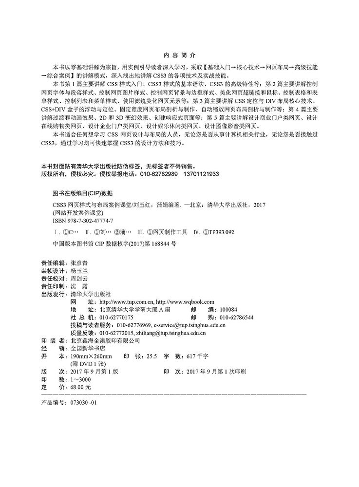 本书以零基础讲解为宗旨,用实例引导读者深入学习,采取【基础入门→核心技术→网页布局→高级技能→综合案例】的讲解模式,深入浅出地讲解CSS3的各项技术及实战技能。 本书第1篇主要讲解CSS样式入门、CSS3样式的基本语法、CSS3的高级特性等;第2篇主要讲解控制网页字体与段落样式、控制网页图片样式、控制网页背景与边框样式、美化网页超链接和鼠标、控制表格和表单样式、控制列表和菜单样式、使用滤镜美化网页元素等;第3篇主要讲解CSS定位与DIV布局核心技术、CSS+DIV盒子的浮动与定位、固定宽度网页布局剖析与制作、自动缩放网页布局剖析与制作等;第4篇主要讲解过渡和动画效果、2D和3D变幻效果、创建响应式页面等;第5篇主要讲解设计商业门户类网页、设计在线购物类网页、设计企业门户类网页、设计娱乐休闲类网页、设计图像影音类网页。 本书适合任何想学习CSS网页设计与布局的人员,无论您是否从事计算机相关行业,无论您是否接触过CSS3,通过学习均可快速掌握CSS3的设计方法和技巧。