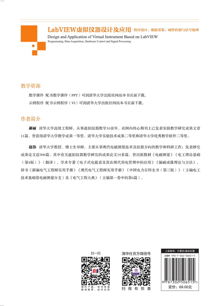郝丽 清华大学高级工程师,从事虚拟仪器教学10余年。在国内核心期刊上已发表实验教学研究成果文章11篇。曾获得清华大学教学成果一等奖、清华大学实验技术成果二等奖和清华大学优秀教学软件二等奖。赵伟 清华大学教授、博士生导师,主要从事现代电磁测量技术及仪器方向的教学和科研工作;发表研究成果论文近300篇,其中有关虚拟仪器教学研究的成果论文10多篇。曾出版教材《电磁测量》《电工理论基础(第4版)》(翻译图书)、学术专著《电子式电能表及其在现代用电管理中的应用》《漏磁成像理论与方法》及辞书《新编电气工程师实用手册》《现代电气工程师实用手册》《电气工程大典》(参编第一卷中的第4篇)等。