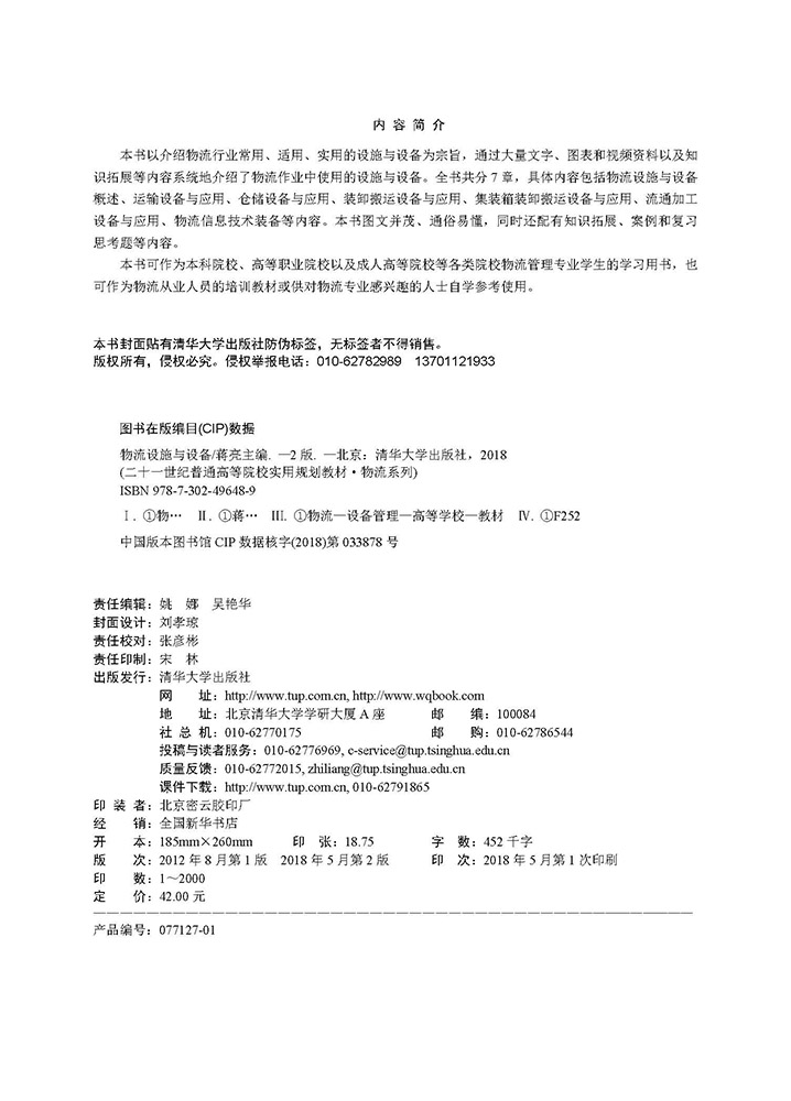 再 版 前 言 物流行业是一个知识与技术、硬件与软件相结合的行业,而技术和硬件的水平主要体现在不同种类的物流设施与设备上。物流作业的整个过程必须通过相应的设备来完成,没有设施与设备可以说就没有高效的物流系统。因此,对于物流专业的学生来说,对设施与设备的熟悉和掌握是非常必要的,这就需要学习“物流设施与设备”这门课程。 本书的第1版是在2012年8月出版的,时至今日已经5年多了,一方面,物流行业在这几年中发生了很大的变化,所用的各种设施与设备也在不断地升级换代,我们需要与时俱进;另一方面,第1版书中很多的数据、图表也已经是5年前的资料了,没能及时更新导致时效性差,本书就显得过时了,无法适应当前的教学要求。所以,在第1版的基础上,结合物流行业近况,对本书进行改版。第2版还是主要介绍了物流运输设备与应用、仓储设备与应用、装卸搬运设备与应用、集装箱装卸搬运设备与运用、流通加工设备与应用、物流信息技术装备等不同领域的物流作业设施与设备。同时,为了更好地介绍各种设备,第2版增加了大量的实物图片和视频,将视频资料通过二维码的方式加载到书本中,读者可以通过扫描二维码来观看设备的视频资料,直观生动,通俗易懂。另外,第2版还增加了很多的知识拓展,力求拓宽知识面,培养学生学习知识的全新思维方式。总之,本书把学习目标定位在对设备基本了解和实际应用上,使读者能够通过对设备的认知来解决实际工作问题,体现出设备是工具的特性。 近年来,电商物流、物流园区、配送中心、第四方物流等物流业态在我国高速发展,与此同时,物流设施与设备的现代化水平也随之不断提高,越来越趋于大型化、自动化和智能化。...