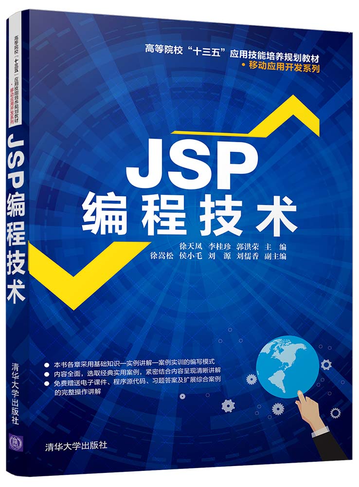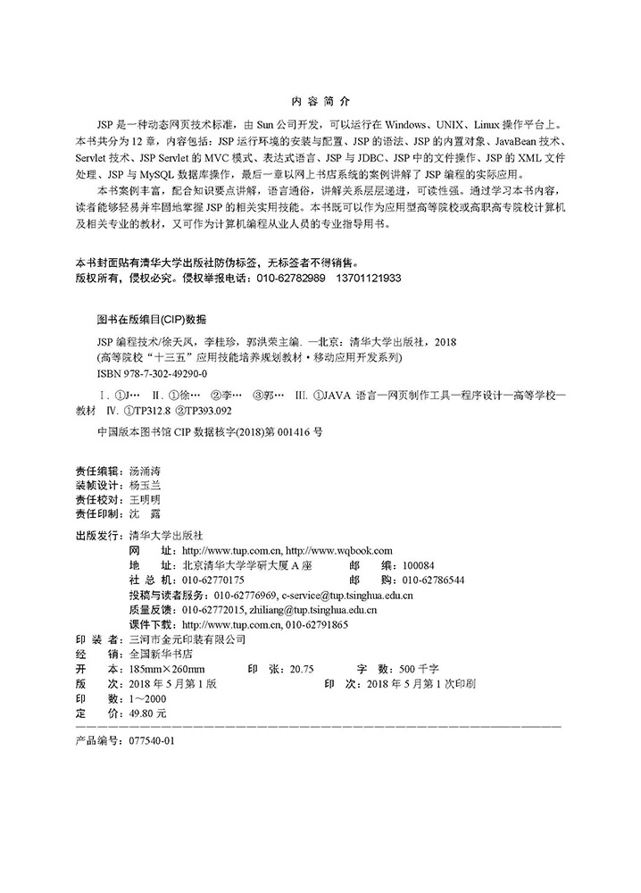 《JSP编程技术》共分为12章,具体内容介绍如下。第1章:JSP基本概述。主要介绍JSP的定义、特点、工作流程、组成元素以及相关的安装与配置。第2章:JSP基础语法知识。主要介绍JSP的基本语法(注释、声明、代码段、表达式)、JSP程序开发模式、调试处理、JSP指令标记和动作标记的使用。第3章:JSP的内置对象。主要介绍JSP中的application、request、response、pageContext、session、out、config Servlet、page JSP、exception 9个内置组件的应用。第4章:JavaBean技术。主要介绍JavaBean的定义、工具、规范、属性、事件应用。第5章:Servlet技术。主要介绍Servlet的定义、特点、生命周期、类的方法、跳转的使用、异步处理。第6章:JSP Servlet的MVC模式。主要介绍JSP Servlet的MVC模式,包括模型的生命周期与视图更新、注册登录、与数据库的连接以及文件操作。第7章:表达式语言。主要介绍EL表达式的定义及特点,以及EL表达式的语法、运算规则、内置对象。第8章:JSP与JDBC。主要介绍JDBC的定义、产品组件、建立JDBC连接、JDBC包。第9章:JSP中的文件操作。主要介绍JSP的文件操作,包括File类、字节流读/写文件、RandomAccessFile类、文件的上传或下载。第10章:JSP的XML文件处理。主要介绍XML的定义、用途、基本语法、命名规则、元素的定义、XML的解析方法(DOM、SAX、DOM4j)。第11章:JSP与MySQL数据库操作。主要介绍MySQL数据库的安装、配置、基础操作以及连接JSP的基本操作。第12章:网上书店系统设计。主要利用JSP开发一个网上书店系统,从用户登录、用户选书,到提交订单的每个功能模块的代码都进行了全面详细的分析。