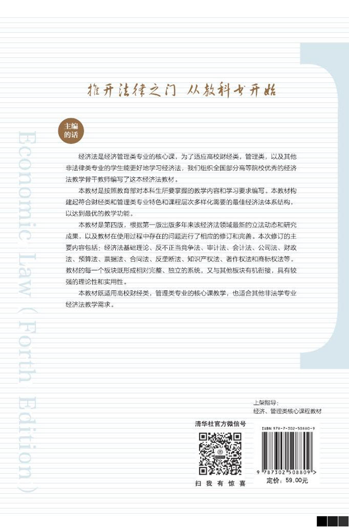 经济法是经济管理类专业的核心课。本书是第四版,根据前三版出版多年来经济法领域最新的立法动态和研究成果,以及教材在使用过程中存在的问题进行了相应的修订和完善。本书也适合其他非法学专业经济法教学需求。