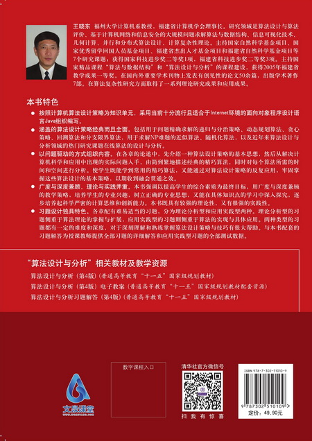 为了适应培养我国21世纪计算机各类人才的需要,结合我国高等学校教育工作的现状,立足培养学生能跟上国际计算机科学技术的发展水平,更新教学内容和教学方法,提高教学质量,本书以算法设计策略为知识单元,系统地介绍计算机算法的设计方法与分析技巧,以期为计算机科学与技术学科的学生提供广泛而坚实的计算机算法基础知识。另有配套的《算法设计与分析(第4版)习题解答》,对本书的全部习题做了详尽的解答。 本书内容丰富,观点新颖,理论联系实际。不仅可用作高等学校计算机专业本科生和研究生学习计算机算法设计的教材,而且也适合广大工程技术人员和自学读者学习参考。