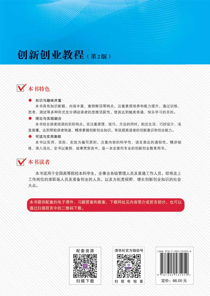 《创新创业教程(第2版)》是一本全面而专业的创新创业教育用书。在编写过程中,以转变教育思想、更新教育观念为基础,以提升学生的创新精神、创业意识和创业能力为核心,以通俗的语言、丰富的实例、有效的训练,系统地介绍创新创业的基本思维方式、相关技能方法等。内容全面,具有较强的知识性、技能性和实用性,符合国家教育部和高等院校转型发展的人才培养需要。 《创新创业教程(第2版)》共分为9章,主要包括创新与创新能力,创新思维,创新方法与技巧,创新思维训练与创新能力培养,创业、创业精神与创业者,创业机会与商业模式、创业资源与创业风险、创业项目与创业计划、新企业的开办与管理等内容。每章都安排了相应的训练、思考和测试内容,可以帮助读者通过实际训练及时、全面地掌握各章的内容。 《创新创业教程(第2版)》可作为高等院校本、专科创新创业教育的通用教材,也可作为企业继续教育的培训教材或是个人进行创新创业的自学教材,还可以作为拓宽视野、增长知识的普及用书。 《创新创业教程(第2版)》的电子课件、习题答案和教案可以到http://www.tupwk.com.cn/downpage网站下载,也可以通过扫描前言中的二维码下载。